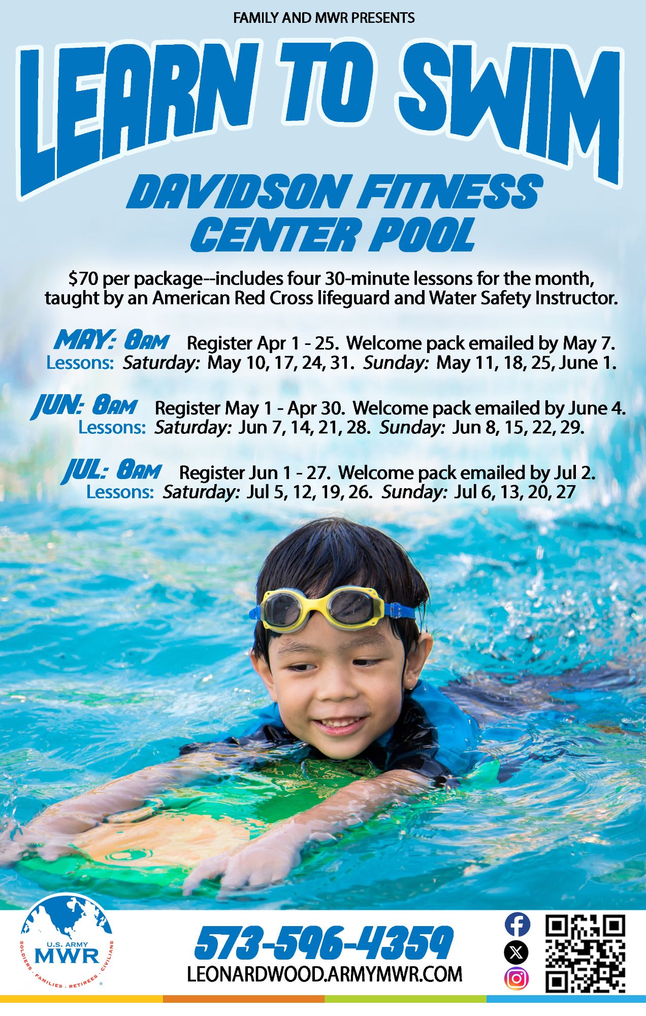 Register Now!MWR is excited to start the Kids Learn to Swim Lessons back up! Lessons will be held in the Davidson Fitness Center Indoor Pool.