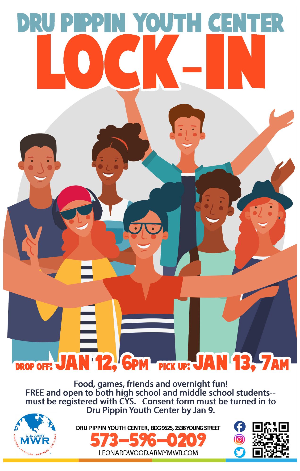 Join us at Dru Pippin Youth Center for food, games, friends, and overnight fun!