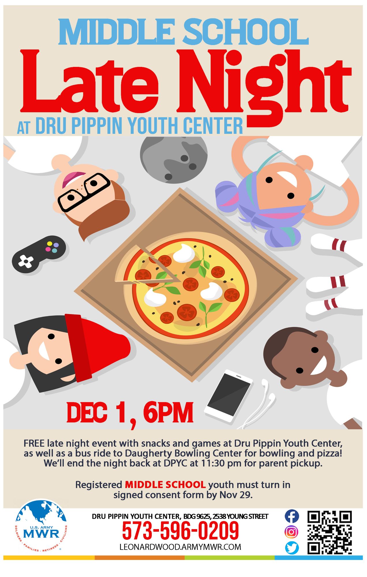 Middle Schoolers, are you ready for a night full of fun!? Join us for this late night event with snacks & games at Dru Pippin Youth Center, as well as a bus ride to Daugherty Bowling Center for bowling & pizza!