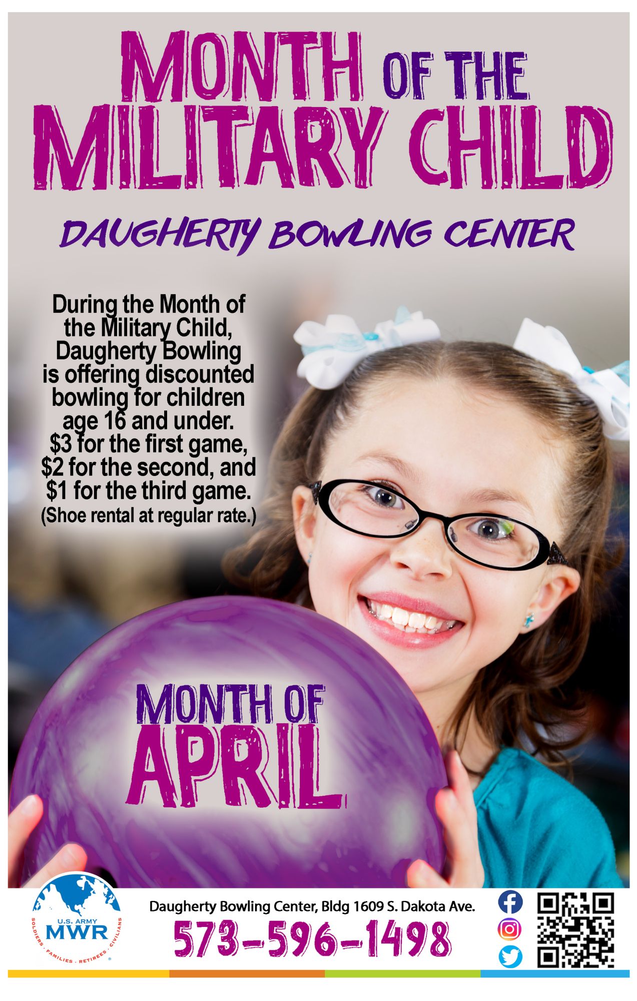 During the Month of the Military Child (April), Daugherty Bowling Center will be offering discounted bowling for children ages 16 & under.
