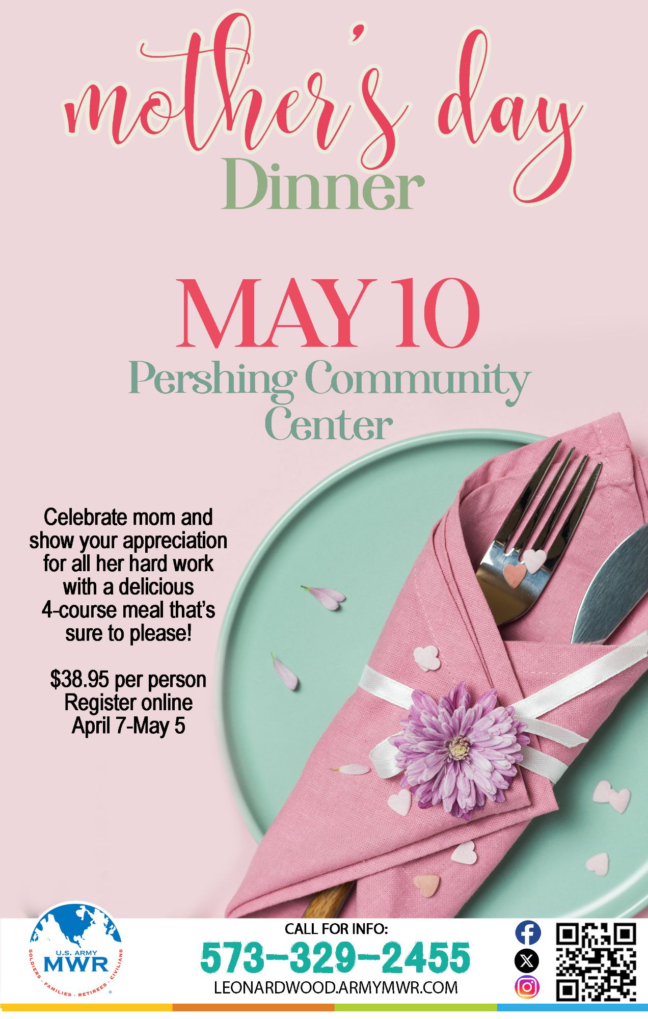 Mother's Day Dinner will be at Pershing Community Center. Check-in at 5:30 pm. Dinner will be served at 6 pm.