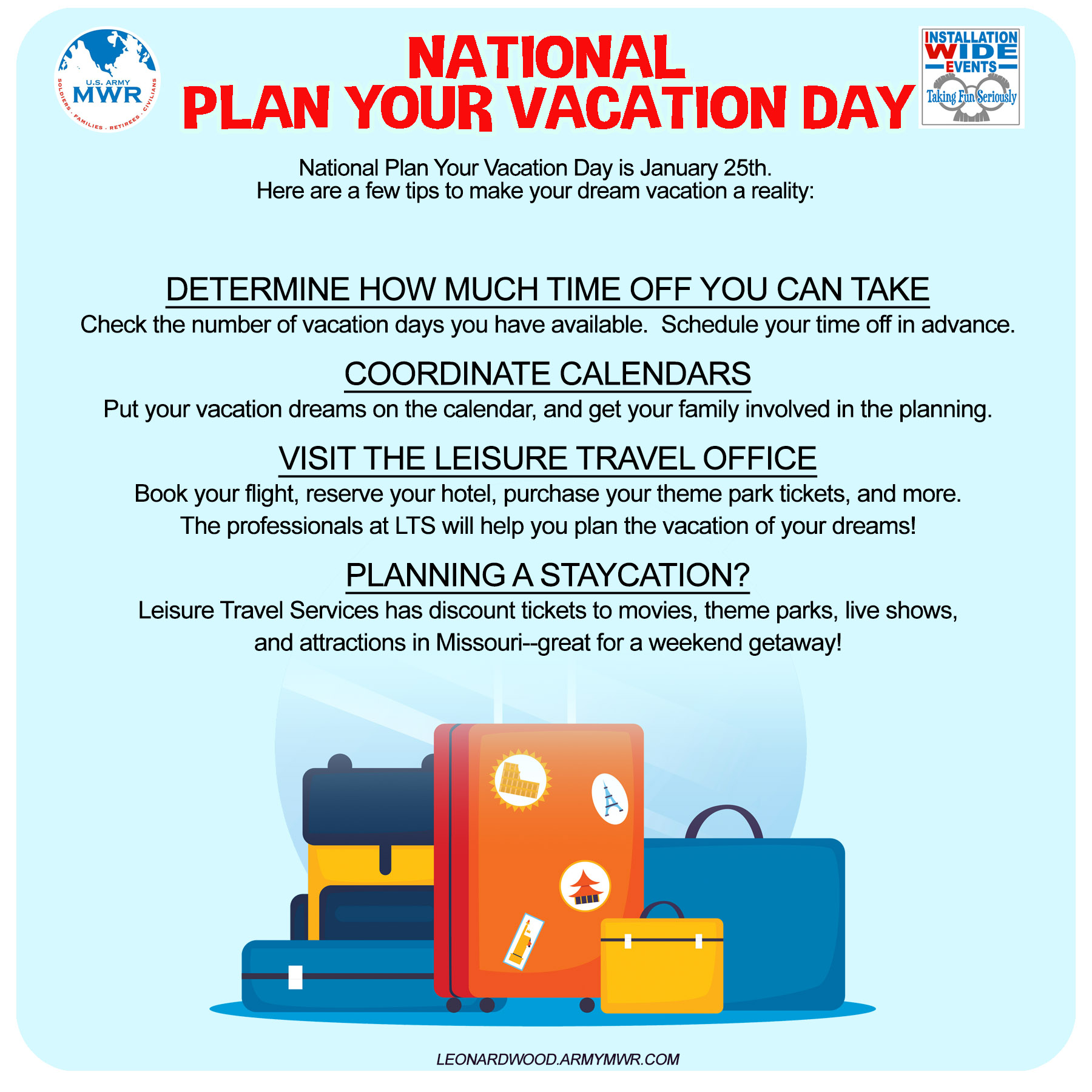 Plan your vacation at the start of the year for the rest of the year! Planning a vacation doesn't have to be a monumental task - let the professionals at MWR Leisure Travel Services assist you with all your travel needs, near or far! Contact LTS at +1 (573)329-8587.