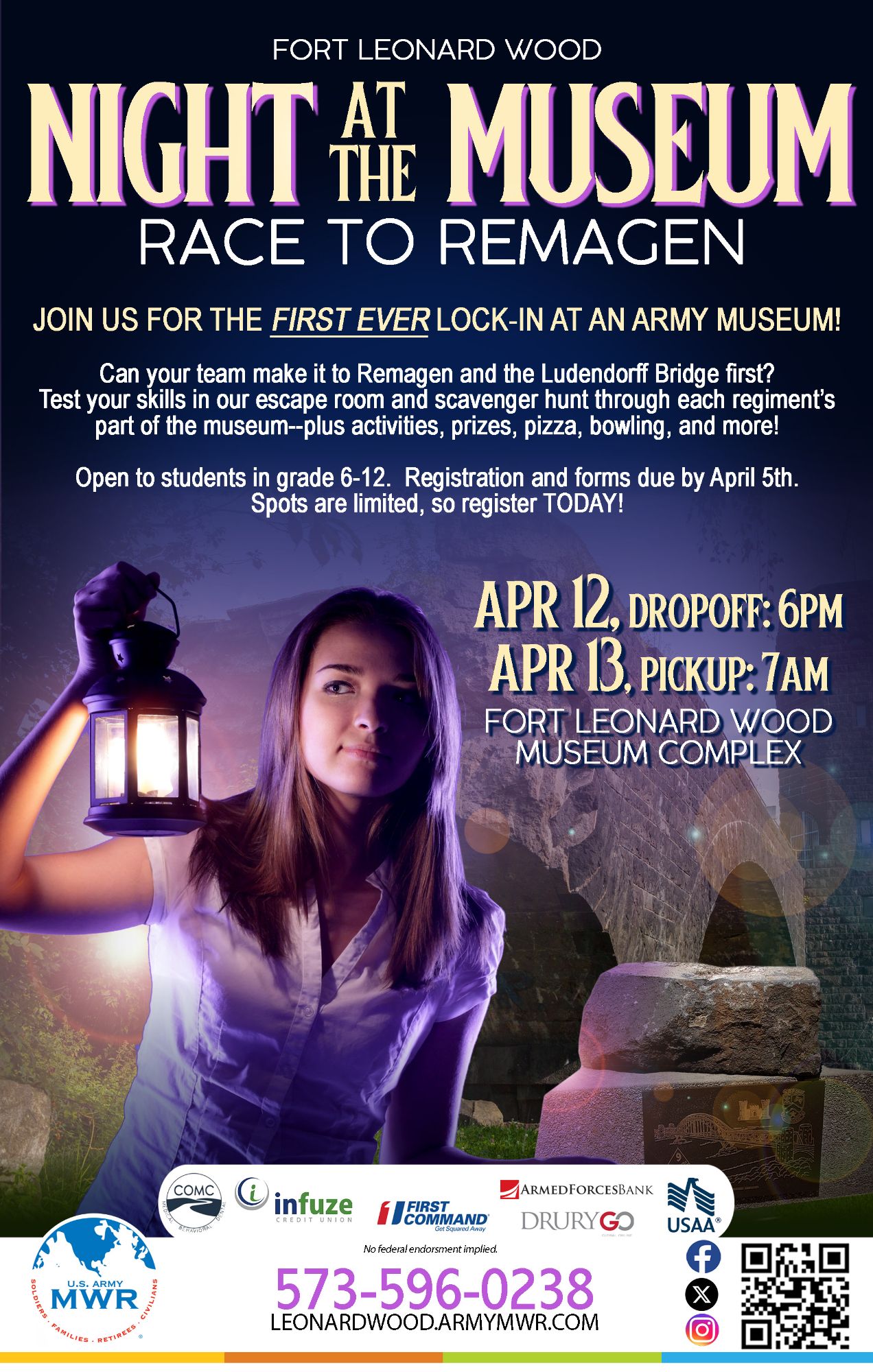 Join us for the FIRST EVER lock-in at an Army Museum! Night at the Museum: Race to Remagen will be held in the Fort Leonard Wood Museum Complex.