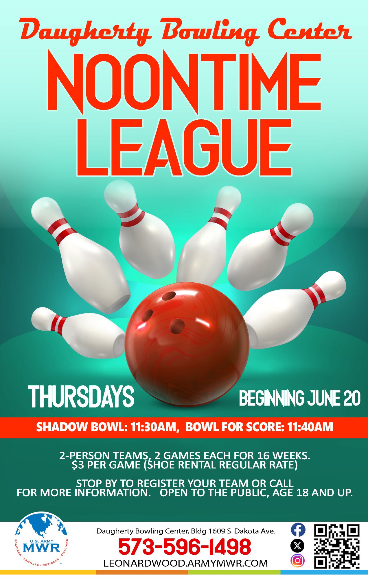 Join Daugherty Bowling Center for their Noontime League beginning 20 June! 2-person teams will bowl 2 games each for 16 weeks.