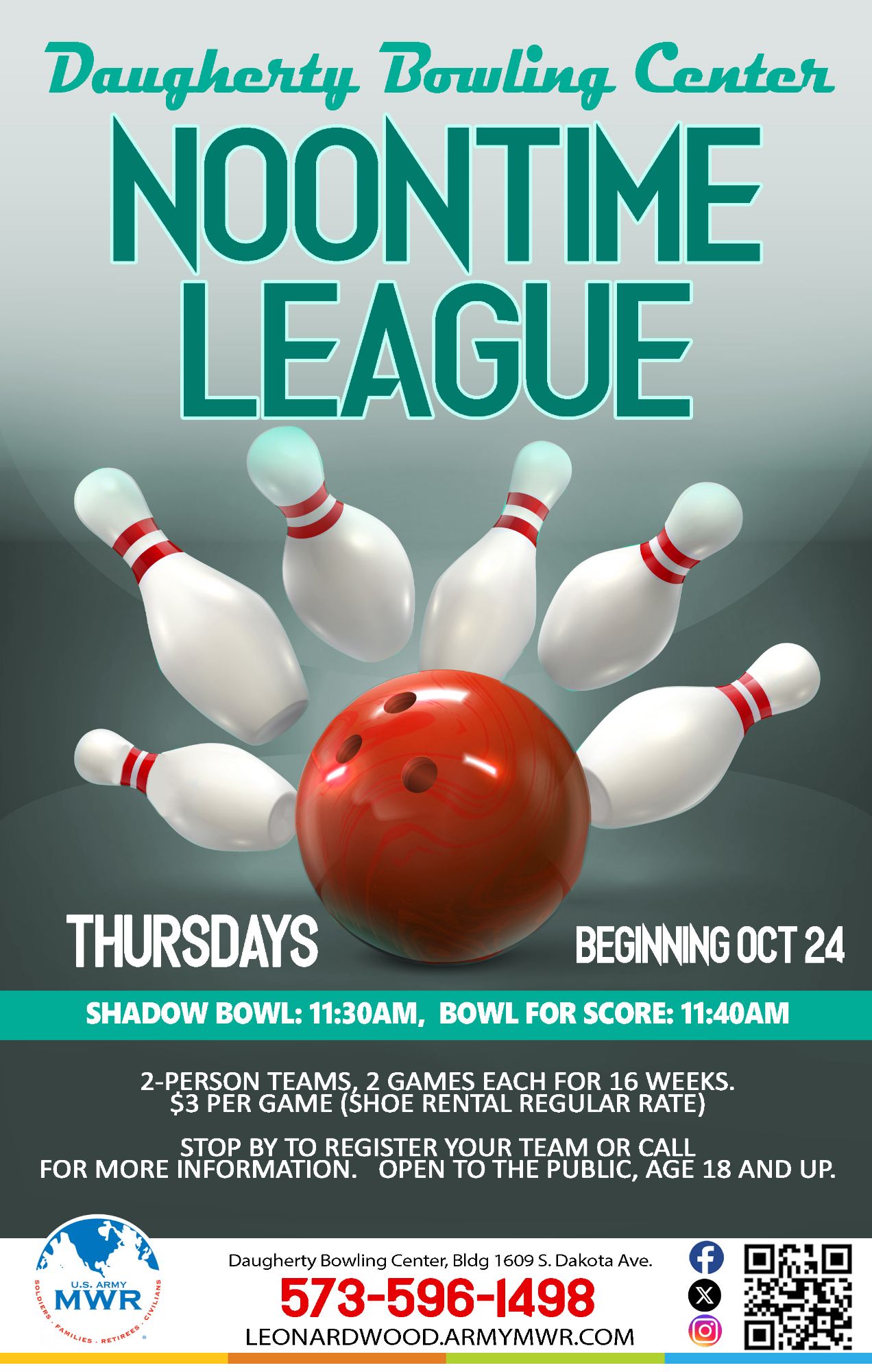 Join us at Daugherty Bowling Center for the Noontime League beginning 24 October. 2-person teams will bowl 2 games each for 16 weeks.
