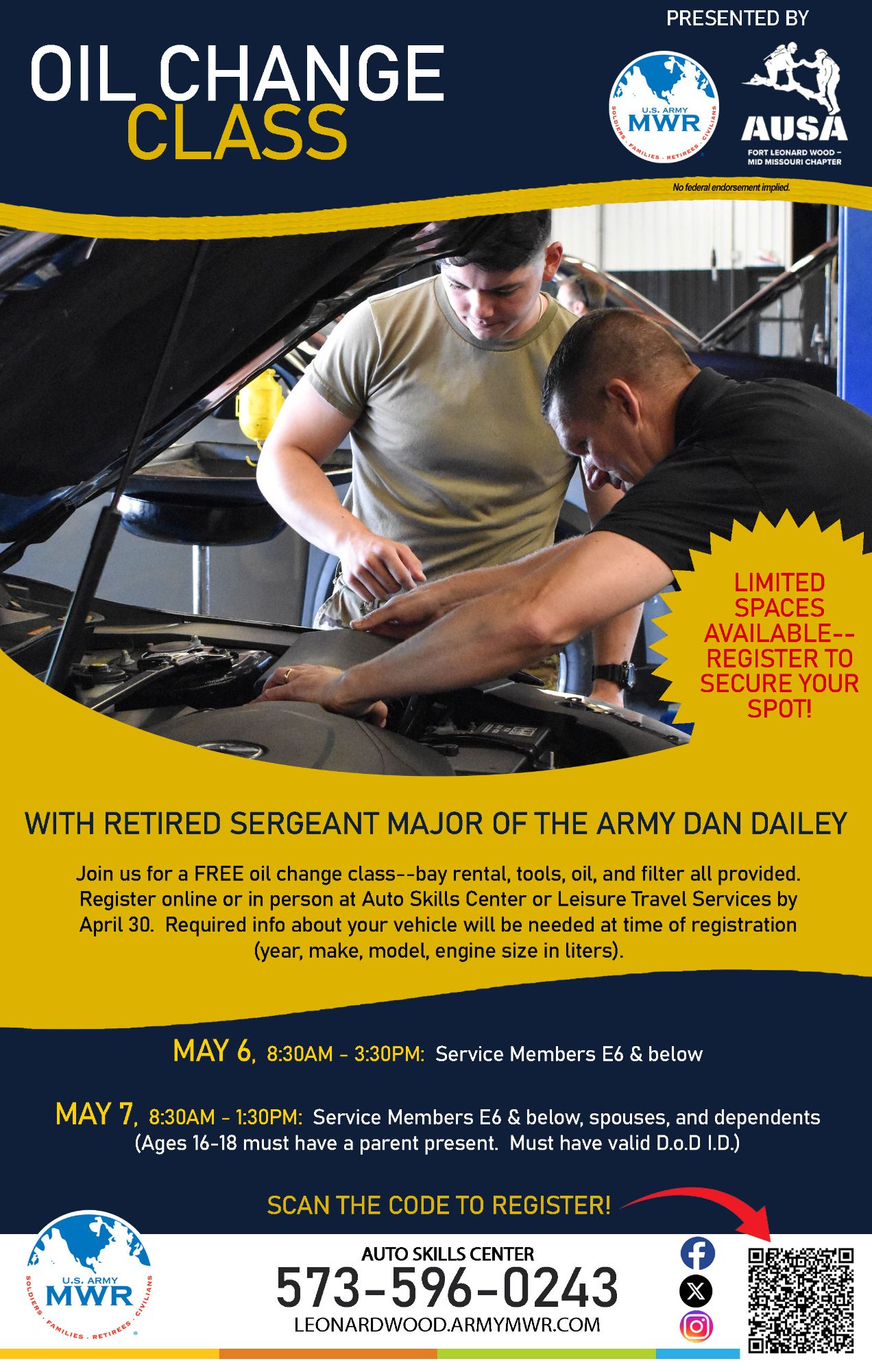 Register Now!Join us at Auto Skills Center for this Oil Change Class presented by AUSA with Retired Sergeant Major of the Army, Dan Dailey!