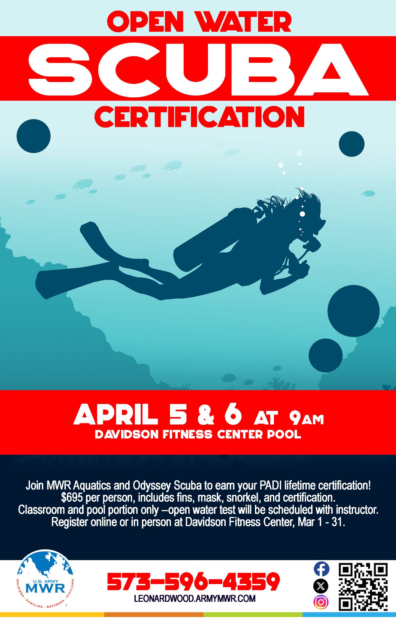 Register Now!Join MWR Aquatics to earn your PADI lifetime certification! Class will be held at DFC Indoor Pool on 5-6 April.