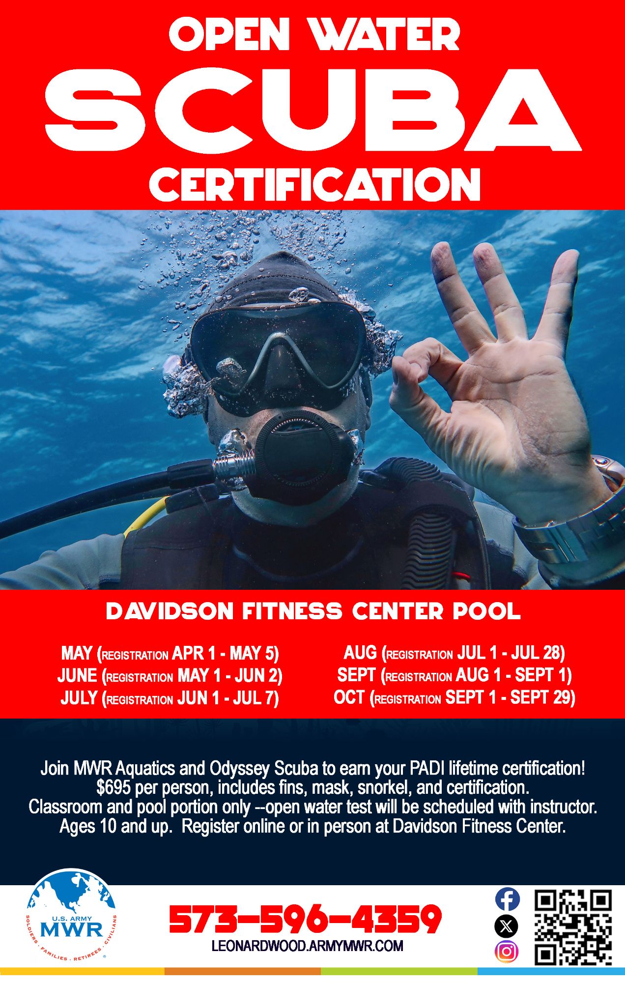 Join MWR Aquatics and Odyssey Scuba to earn your PADI lifetime certification! Open to ages 10+.