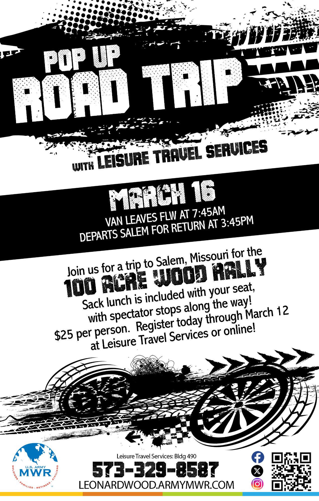 Register Now!Don't miss this Pop-Up Road Trip with Leisure Travel Services! Join us for a trip to Salem, Missouri for the 100 Acre Wood Rally!
