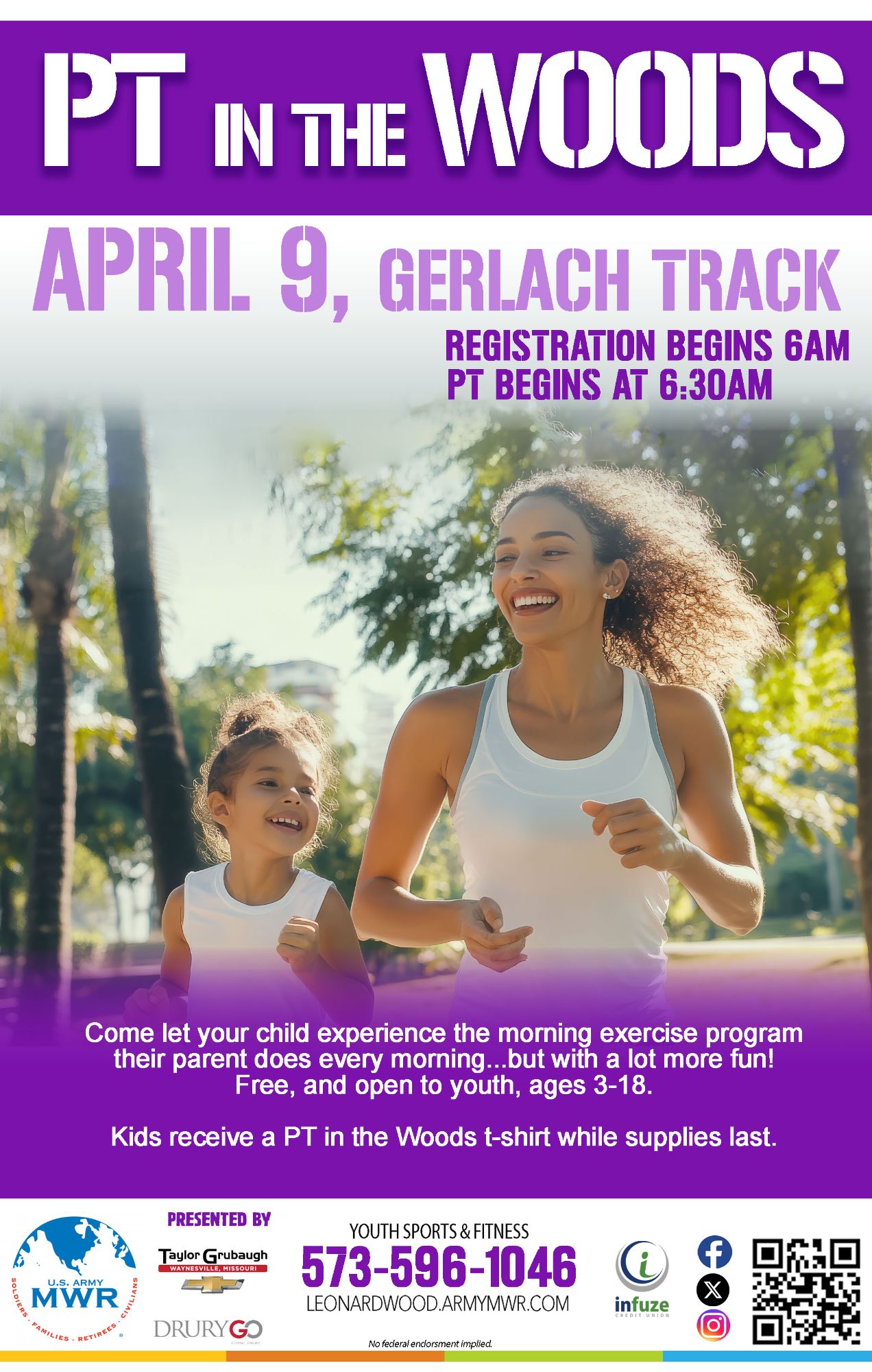 Open to ages 3-18. Kids will receive a PT in the Woods t-shirt while supplies last.