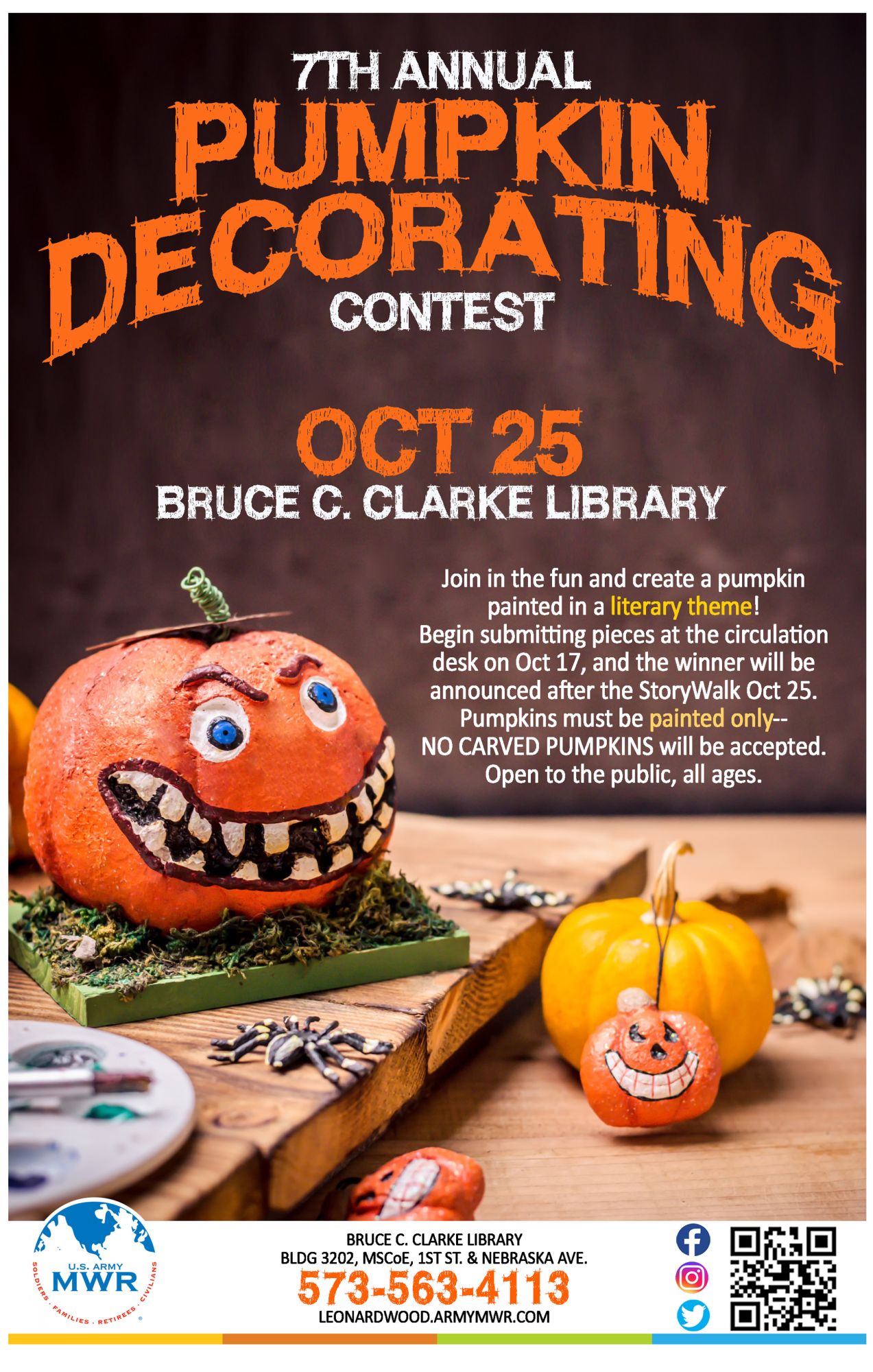 Bruce C. Clarke Library is holding their 7th Annual Pumpkin Decorating Contest! Join in the fun and create a pumpkin painted in a literary theme!
