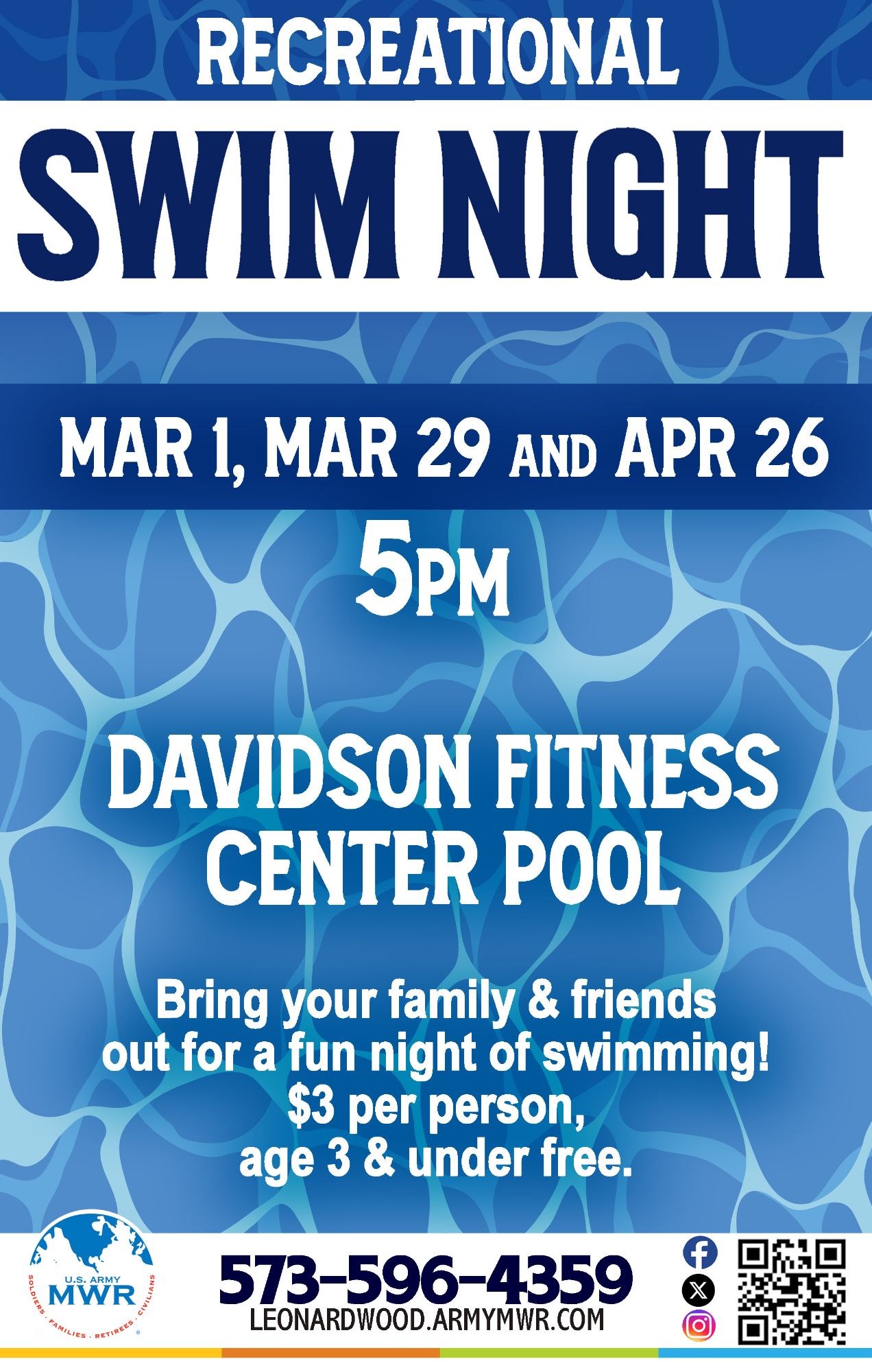 Rec Swim Night scheduled for 26 April has been CANCELLED in support of the Best Sapper Competition.