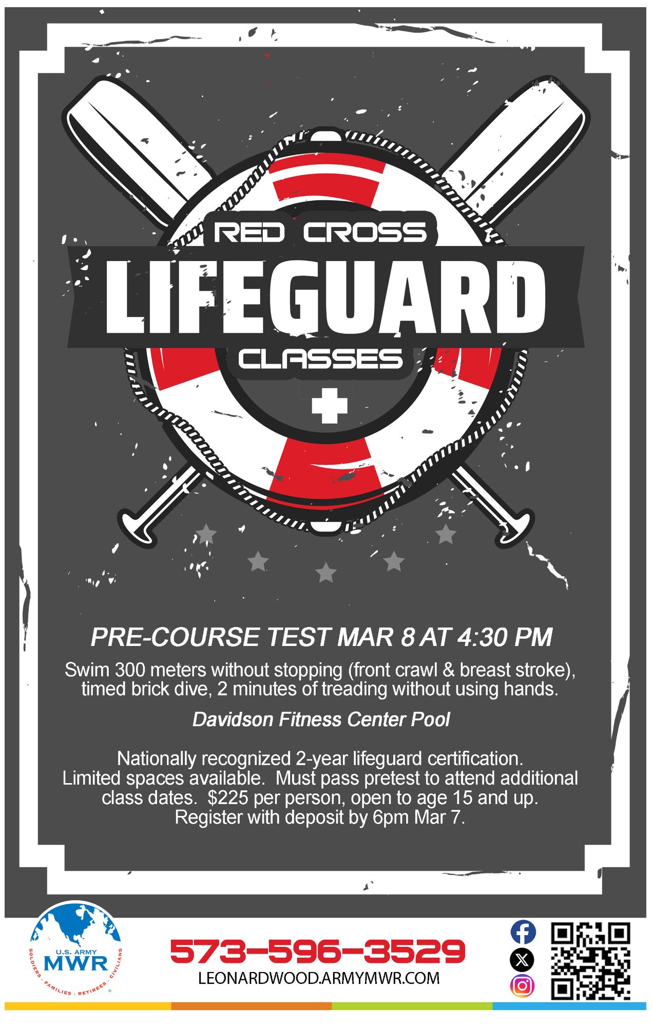 Join us at Davidson Fitness Center Indoor Pool for Red Cross Lifeguard Classes. Pre-course test will be held on 8 March at 4:30 pm. Must pass pre-course to attend additional class dates.