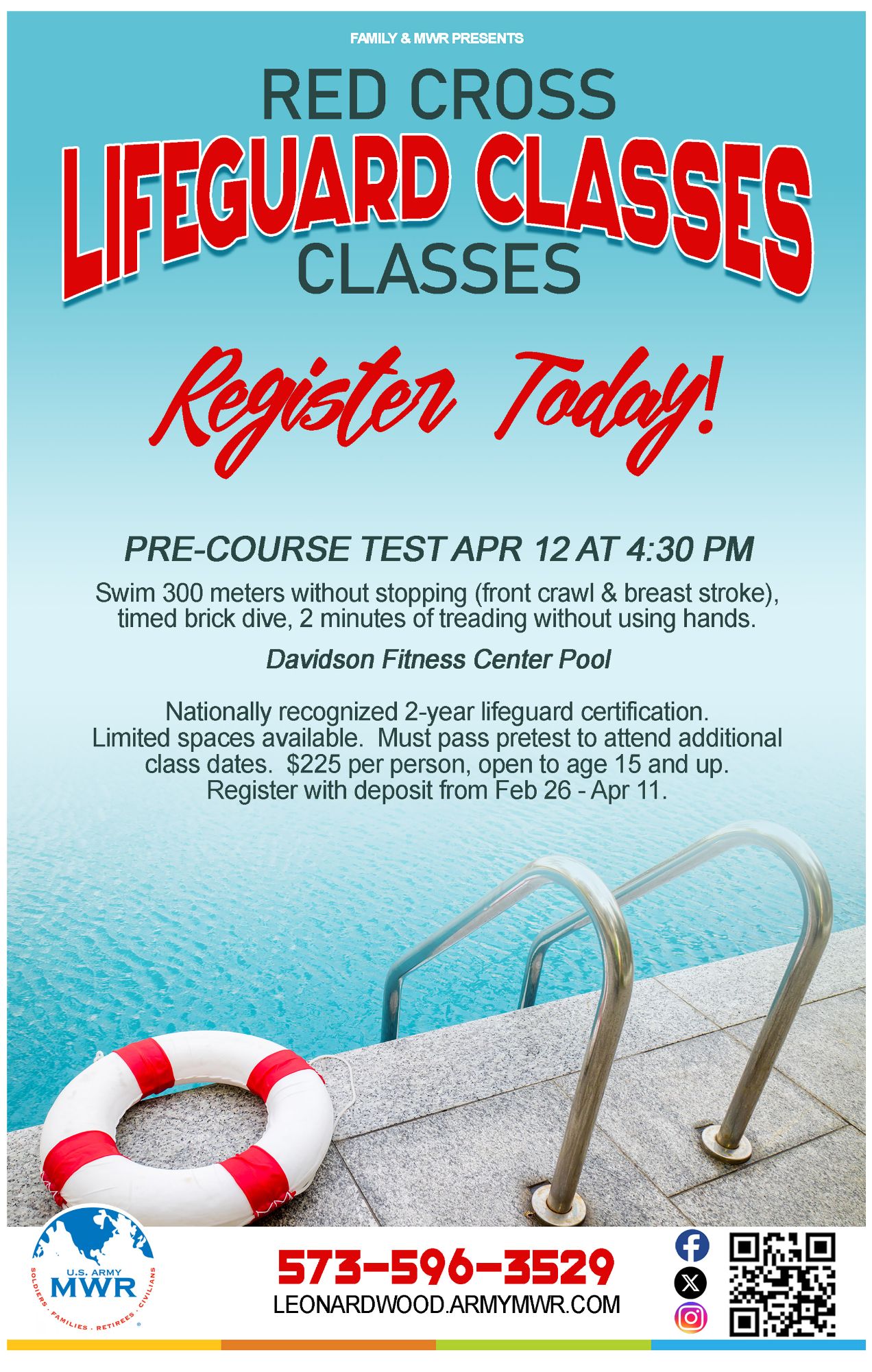 Join us at Davidson Fitness Center Indoor Pool for Red Cross Lifeguard Classes. Pre-course test will be held on 12 April at 4:30 pm. Must pass pre-course to attend additional class dates.
