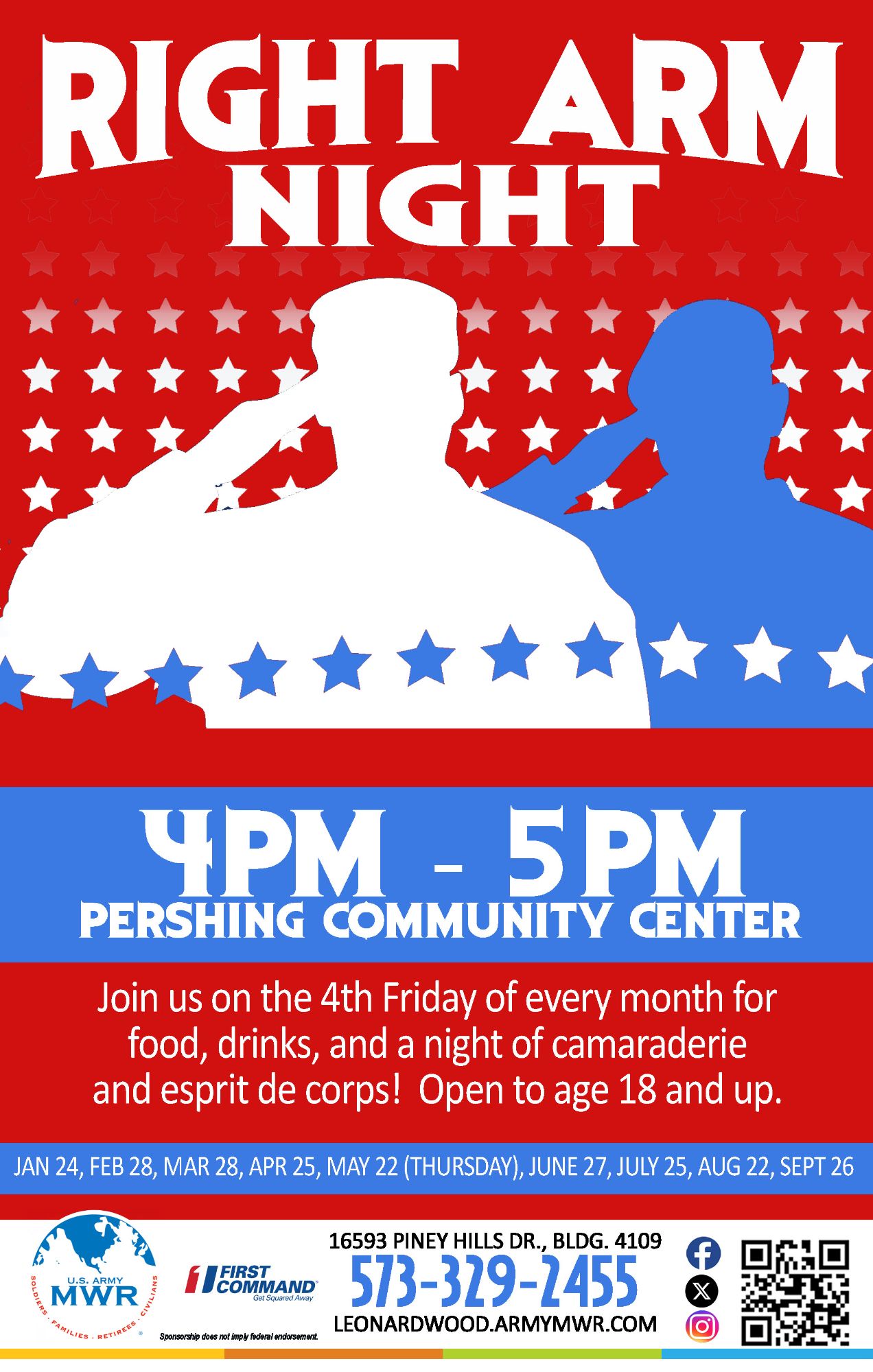 Join every month for food, drinks, and a night of camaraderie & esprit de corps at Right Arm Night!