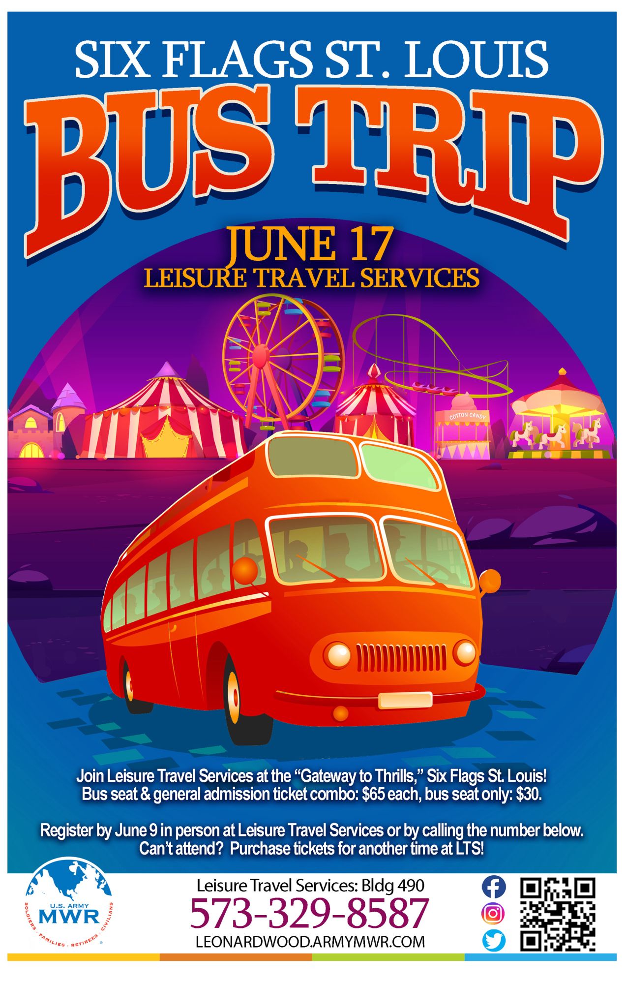Bus will meet the group at Bldg 490 (AAFES Mini Mall) at 9:30 am to head to Six Flags.