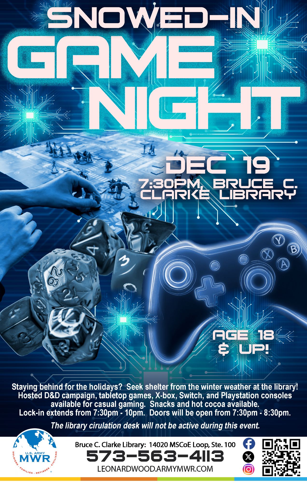 Warm up with some competition during Snowed-In Game Night at Bruce C. Clarke Library! Open to ages 18+.