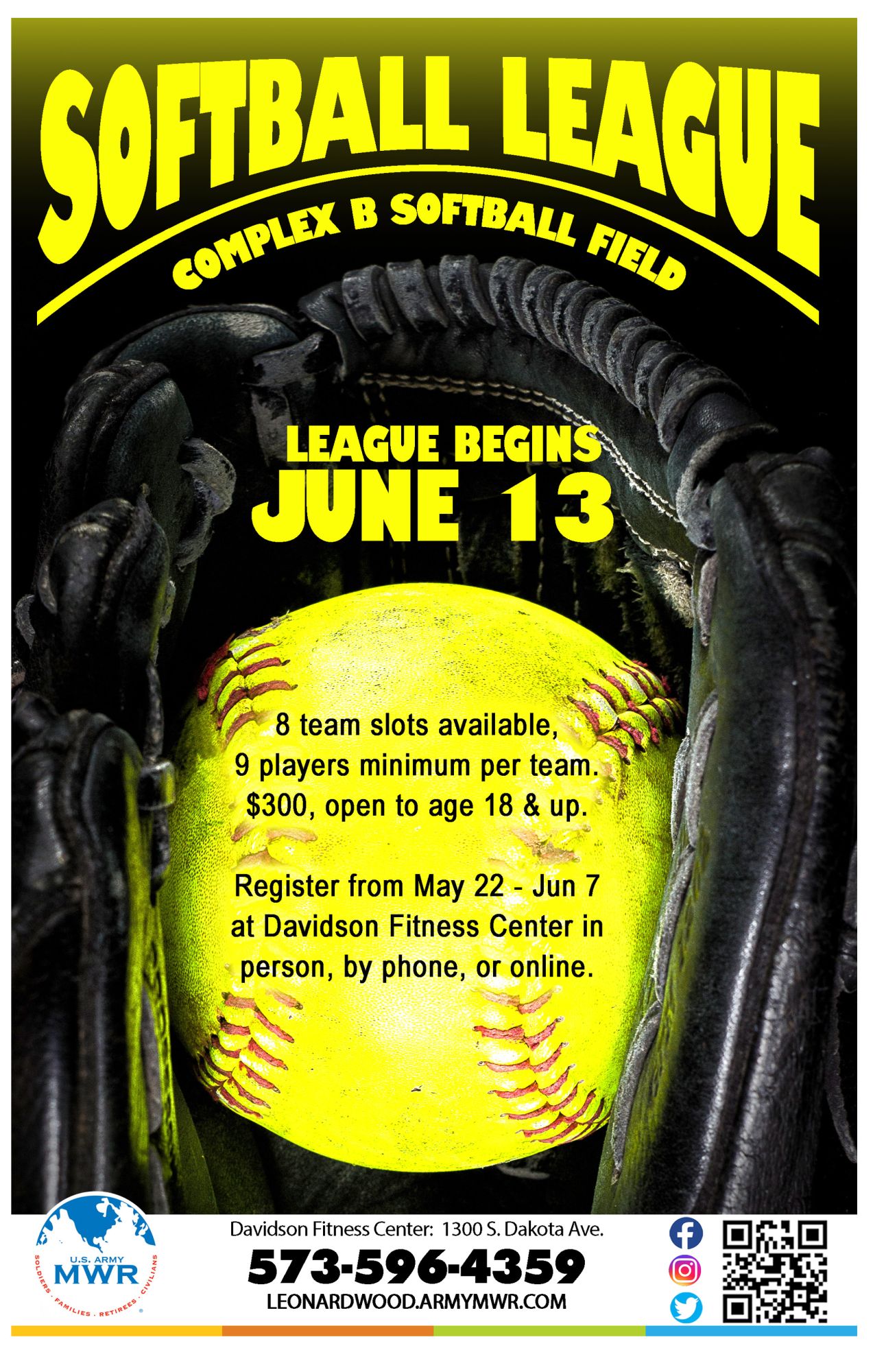 Register Now!Gather your team and join in the Softball League beginning 13 June at Softball Complex B!