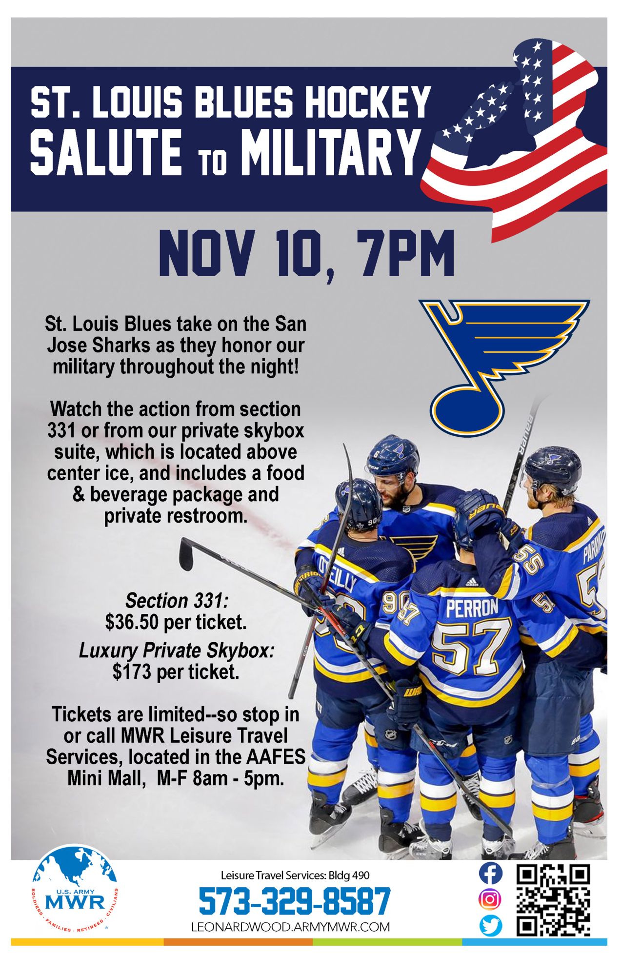 St. Louis Blues take on the San Jose Sharks as they honor our military throughout the night and Leisure Travel Services has tickets!