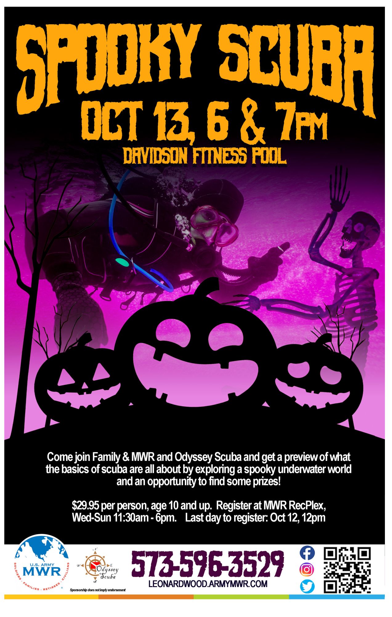 Come join Family & MWR and Odyssey Scuba to learn the basics of scuba while exploring a spooky underwater world! You will also have the opportunity to find some prizes!