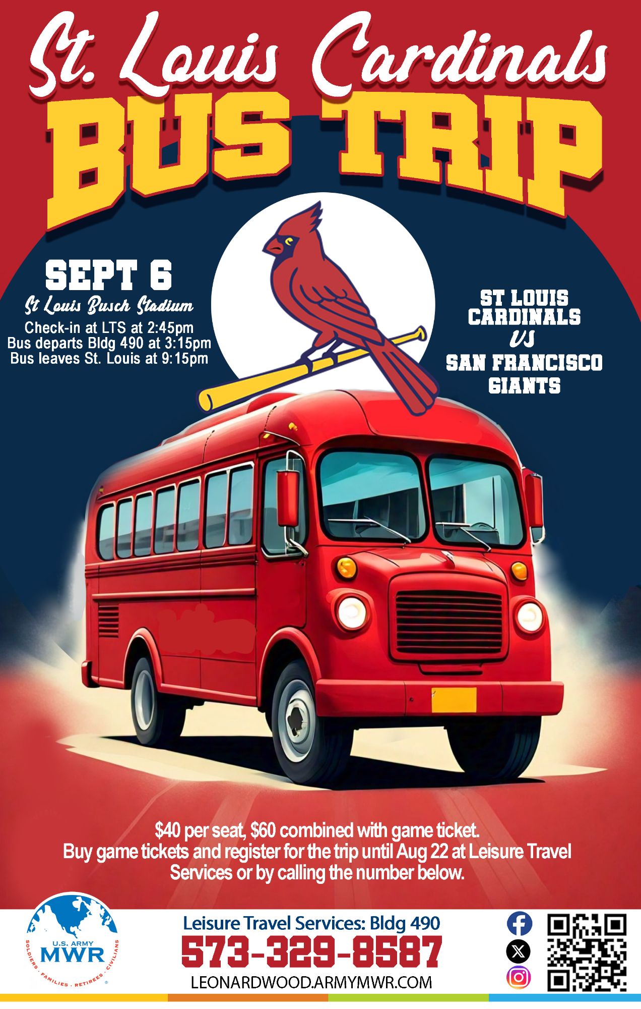 Purchase game tickets and register for the trip until 22 August at Leisure Travel Services or by calling 573-329-8587.
