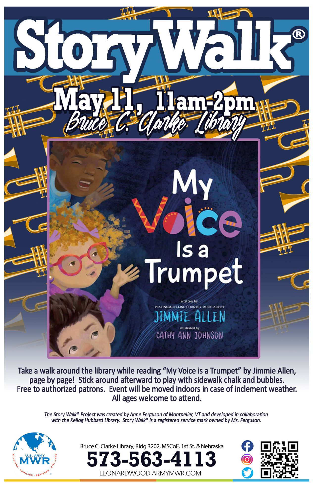 Take a walk at Bruce C. Clarke Library while reading "My Voice is a Trumpet" by Jimmie Allen! After the story, stick around to play with sidewalk chalk & bubbles.
