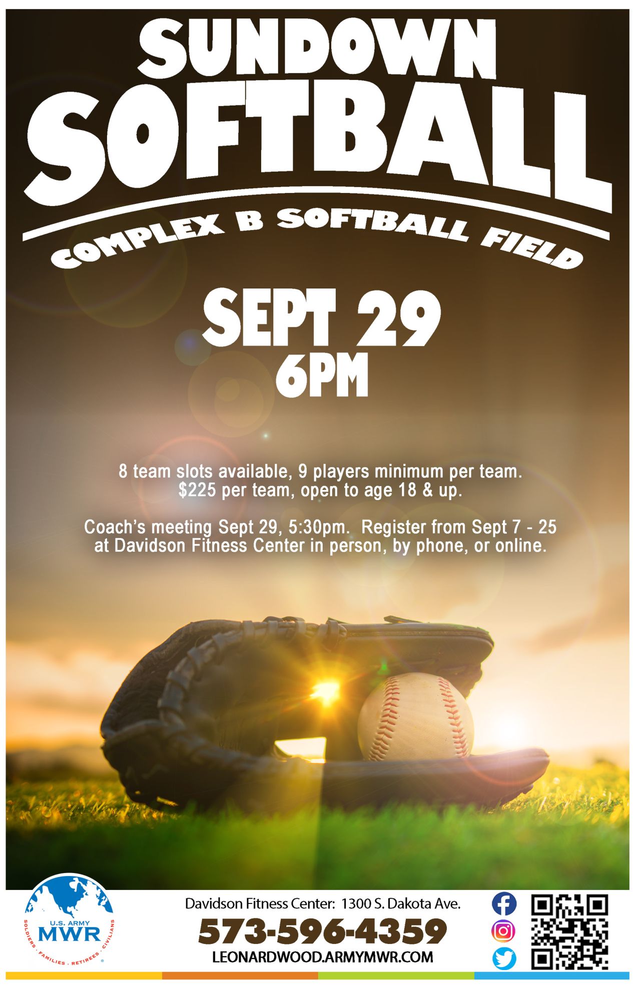 Join us at Softball Complex B for Sundown Softball! Coach's Meeting will be held on 29 September at 5:30 pm. Play begins at 6 pm.