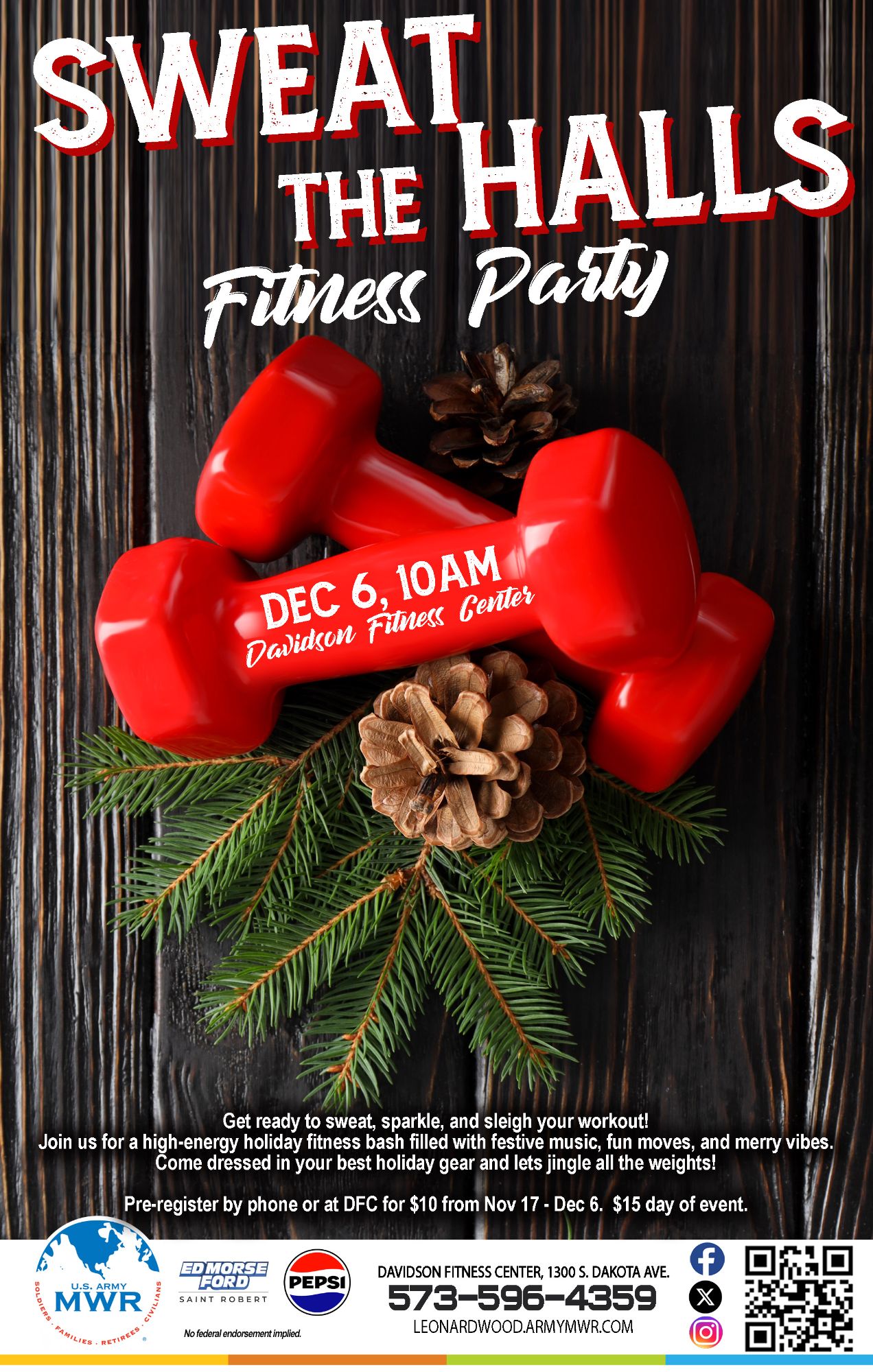 Register in advance from 17 November - 6 December at Davidson Fitness Center or by calling 573-596-4359.