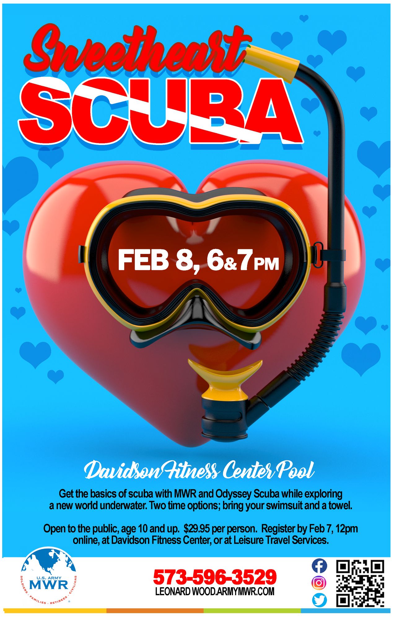 Sweetheart Scuba will be held in the Davidson Fitness Center Indoor Pool. Two time options available: 6 pm & 7 pm.