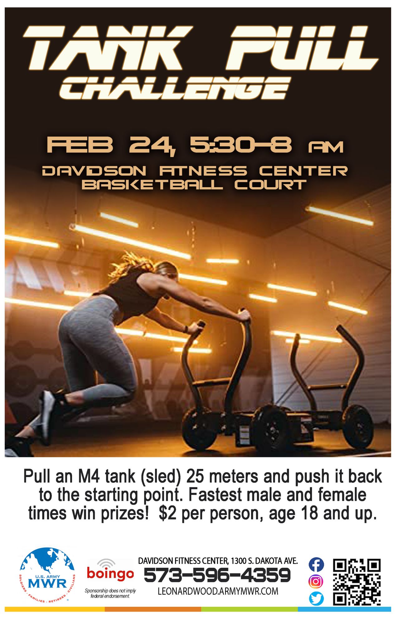 Pull an M4 tank (sled) 25 meters and push it back to the starting point. Fastest male and female times win prizes!