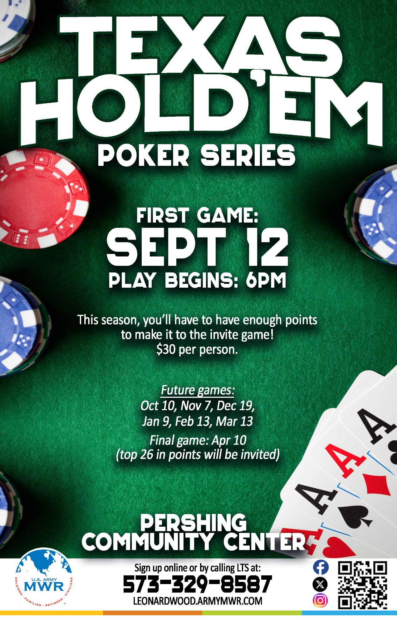 Register Now!Don't miss our Texas Hold'em Poker Series at Pershing Community Center!