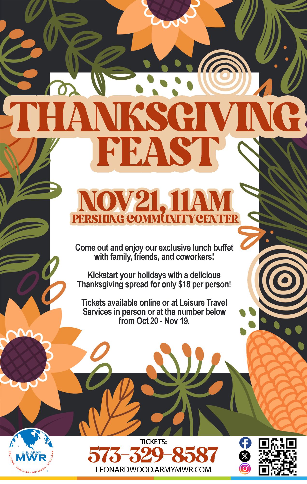 Menu includes: turkey, ham, mashed potatoes, stuffing, sweet potato casserole, mac & cheese, southwestern roasted corn, dinner rolls, pumpkin pie, and bread pudding.