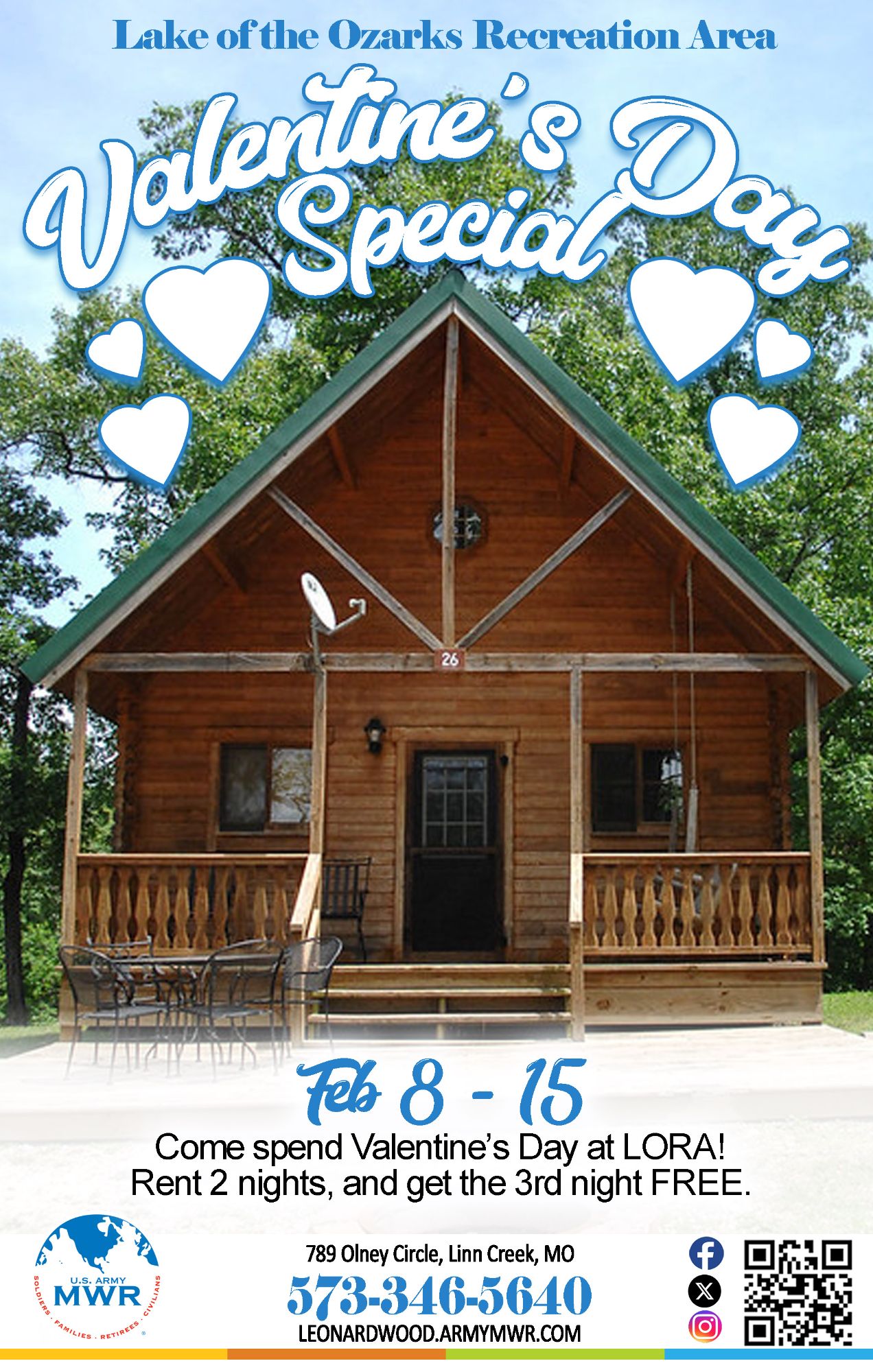 Come spend Valentine's Day at the Lake of the Ozarks Recreation Area! Rent 2 nights and get the 3rd night FREE.