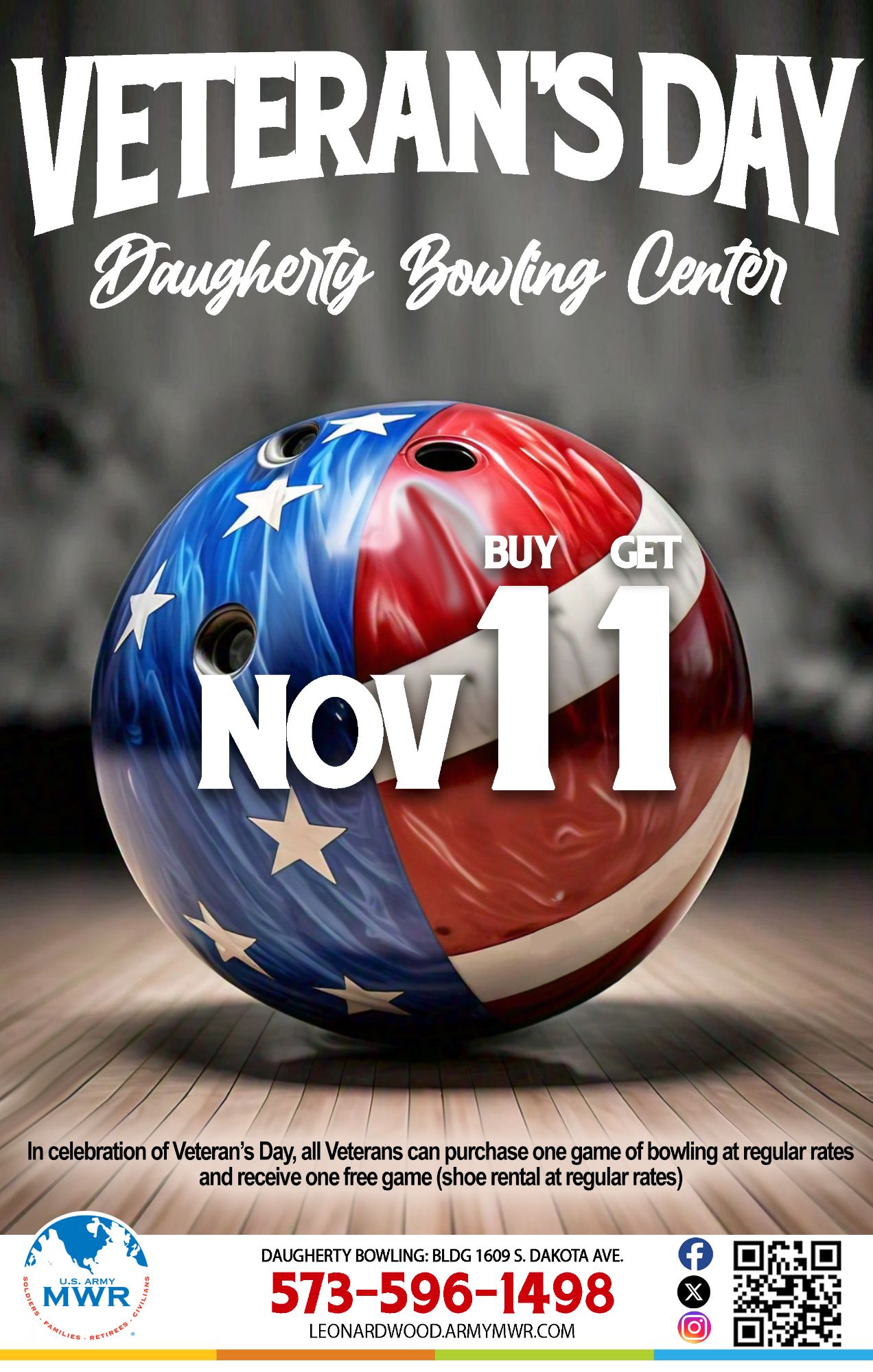 In celebration of Veteran's Day, all Veterans can purchase one game of bowling at regular rates and receive one game FREE!
