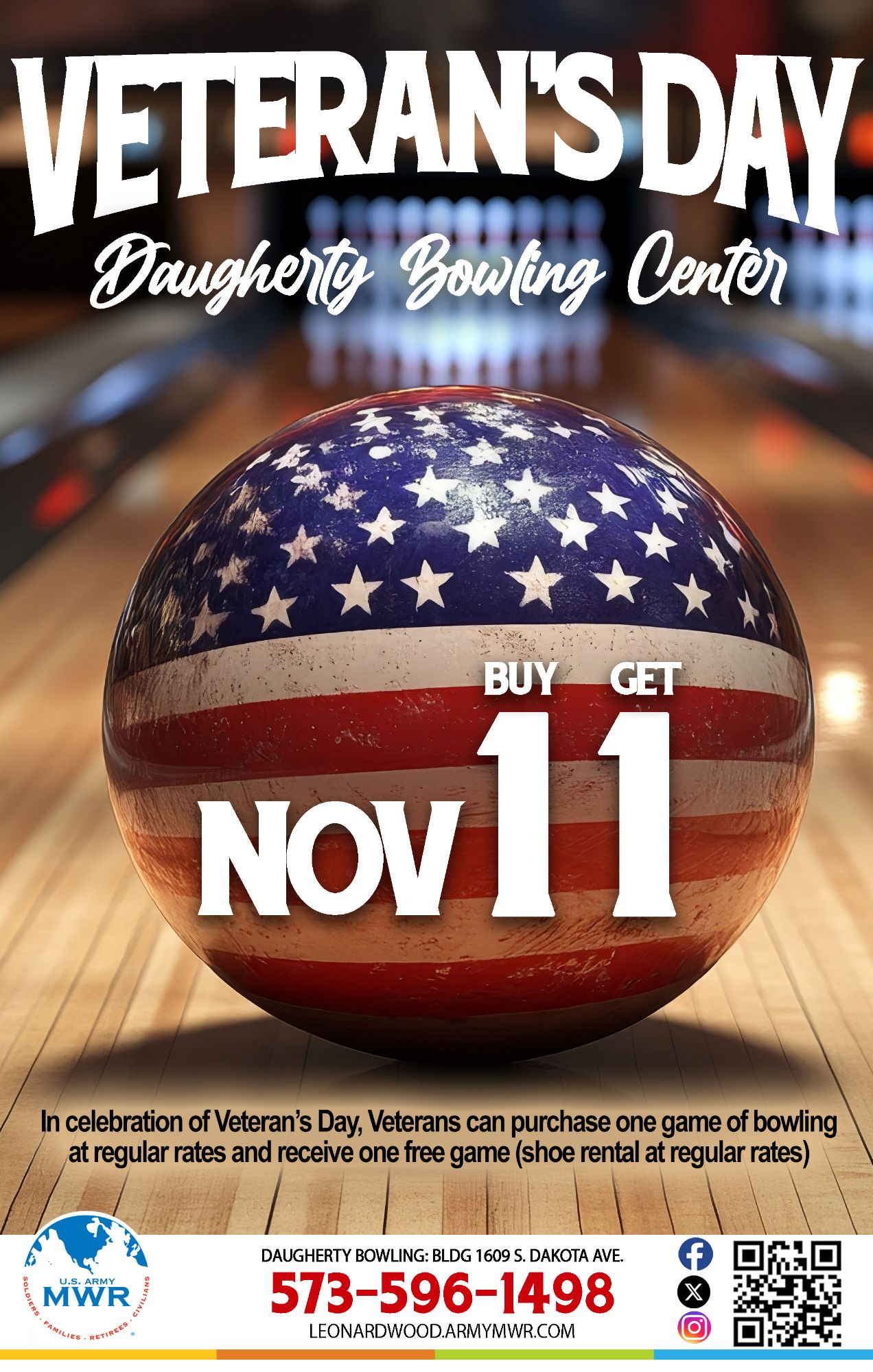 In celebration of Veteran's Day, Veterans can purchase one game of bowling at regular rates and receive one free game!