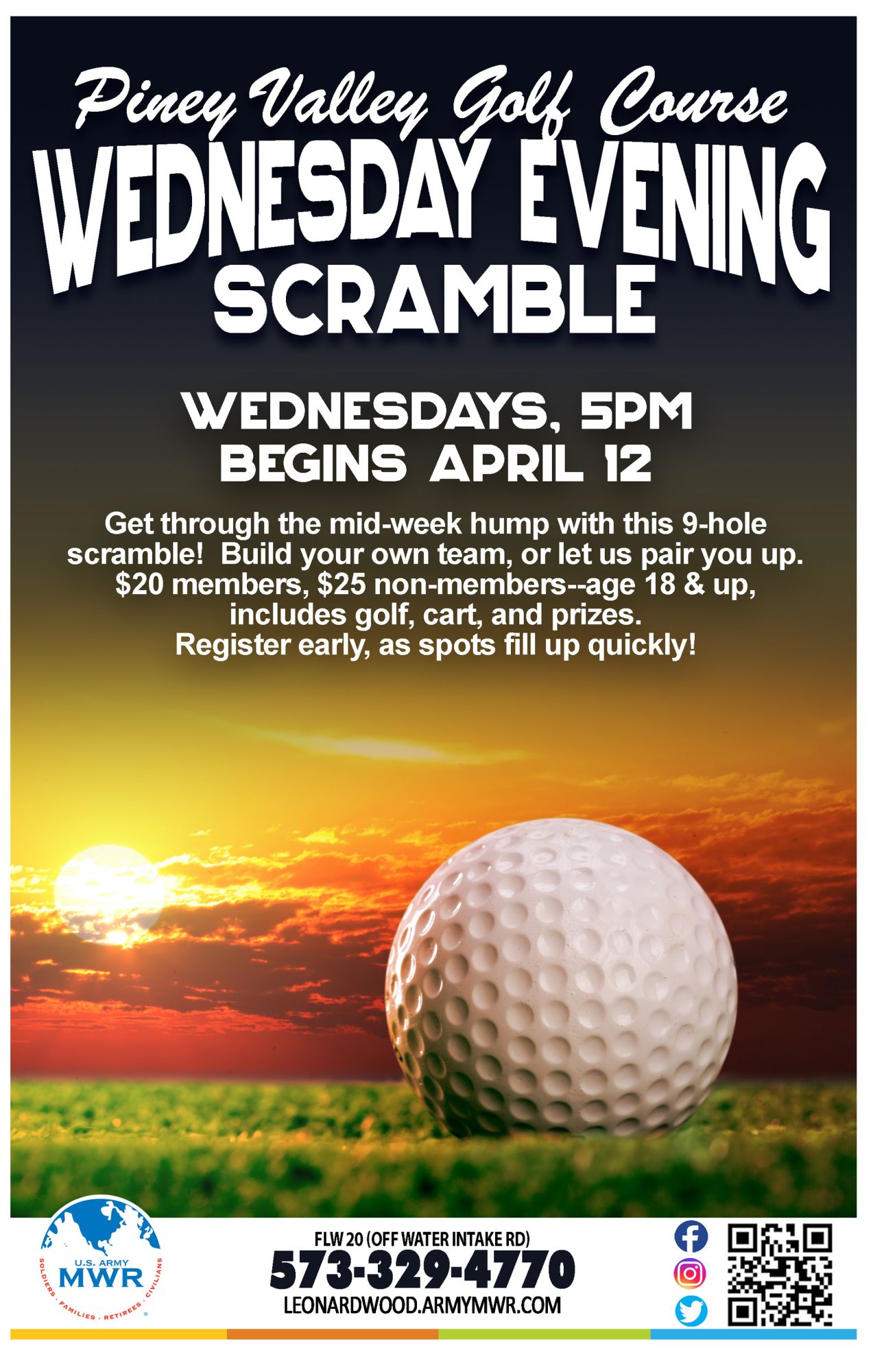 Get through the mid-week hump with this 9-hole scramble! The Wednesday Evening Scramble will be held at Piney Valley Golf Course every Wednesday!