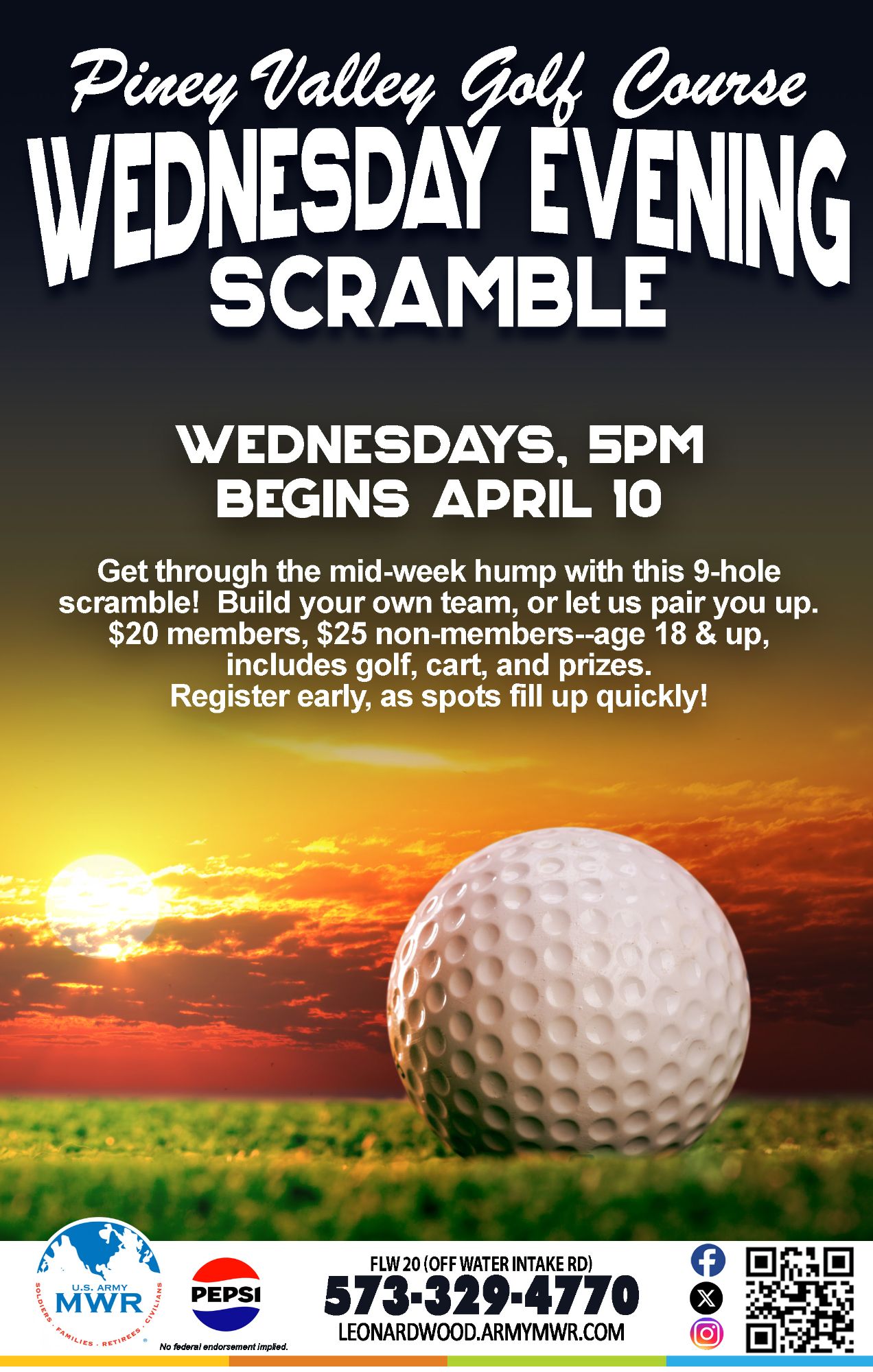 Build your own team, or let us pair you up. Scramble is open to ages 18 & up.