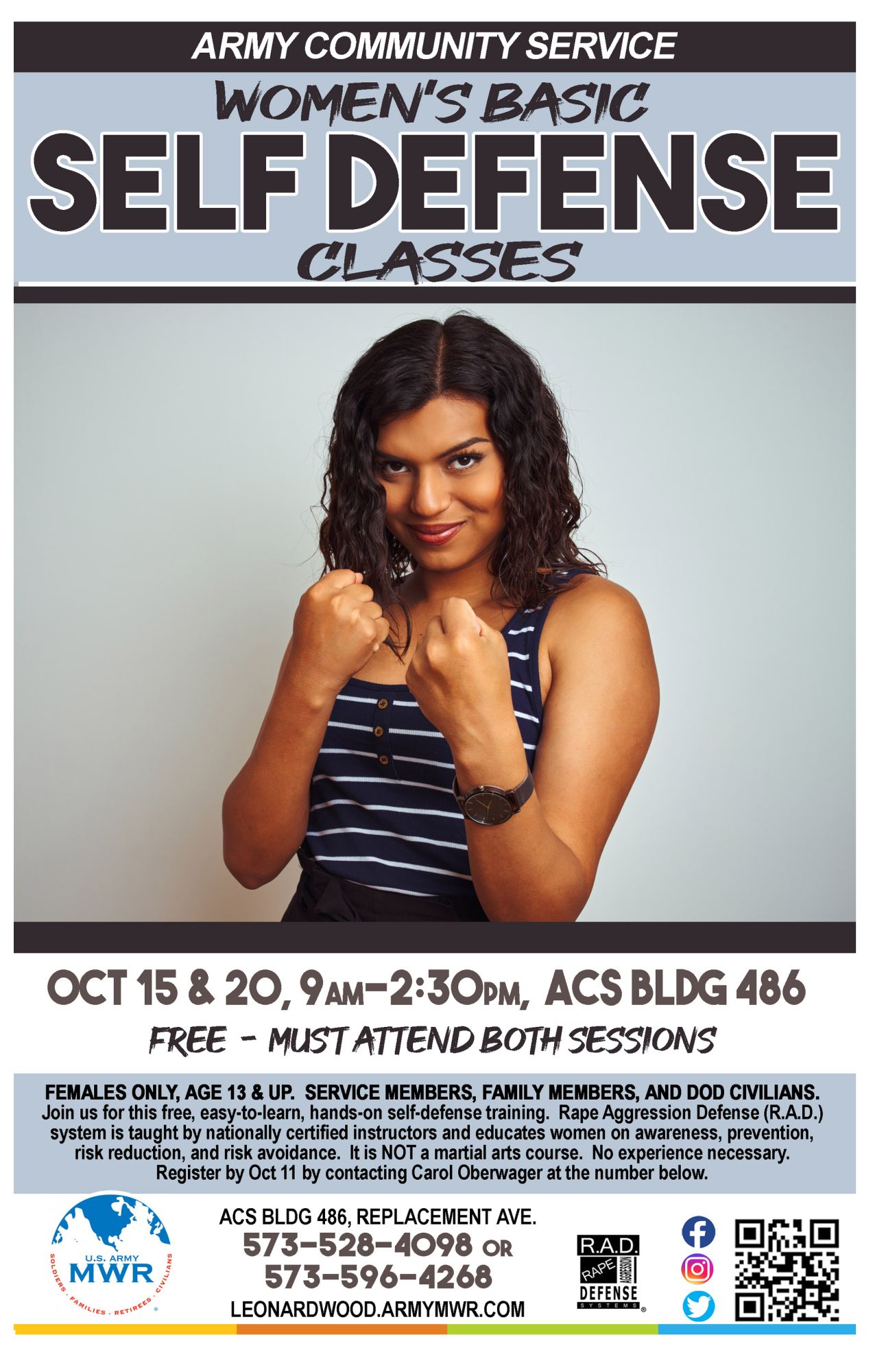 Women's Basic Self Defense Classes will be held at Army Community Service on 15 & 22 October. Participants must attend both sessions.