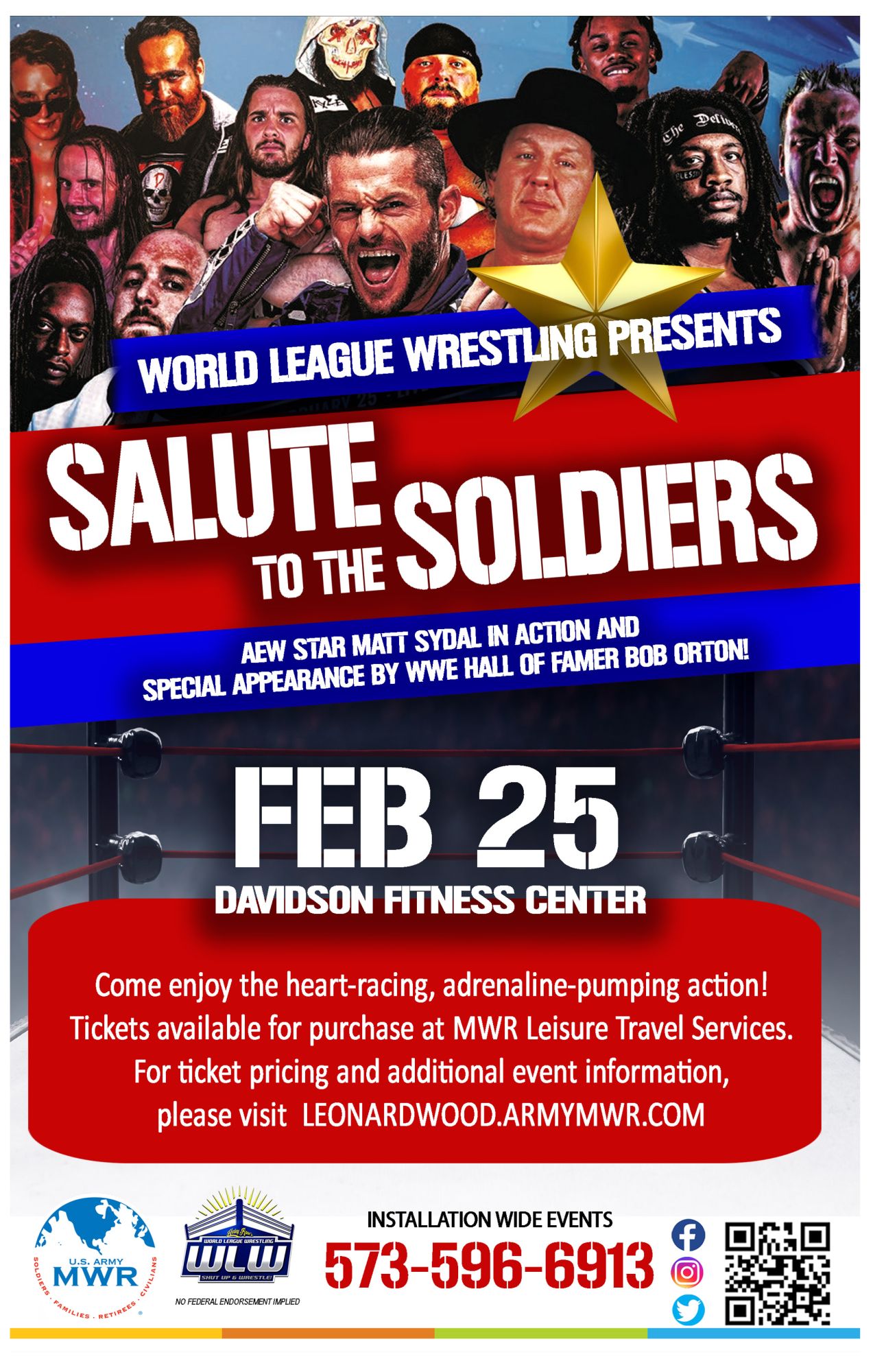 World League Wrestling presents Salute to the Soldiers! Come enjoy the heart-racing, adrenaline-pumping action at Davidson Fitness Center.