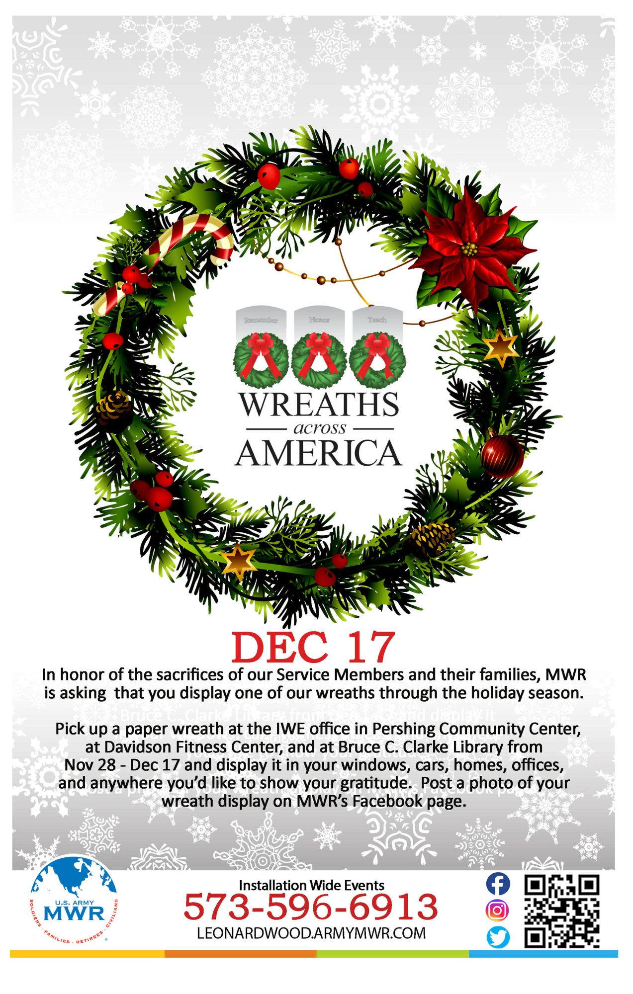In honor of the sacrifices of our Service Members and their families, MWR is asking that you display one of our wreaths throughout the holiday season.