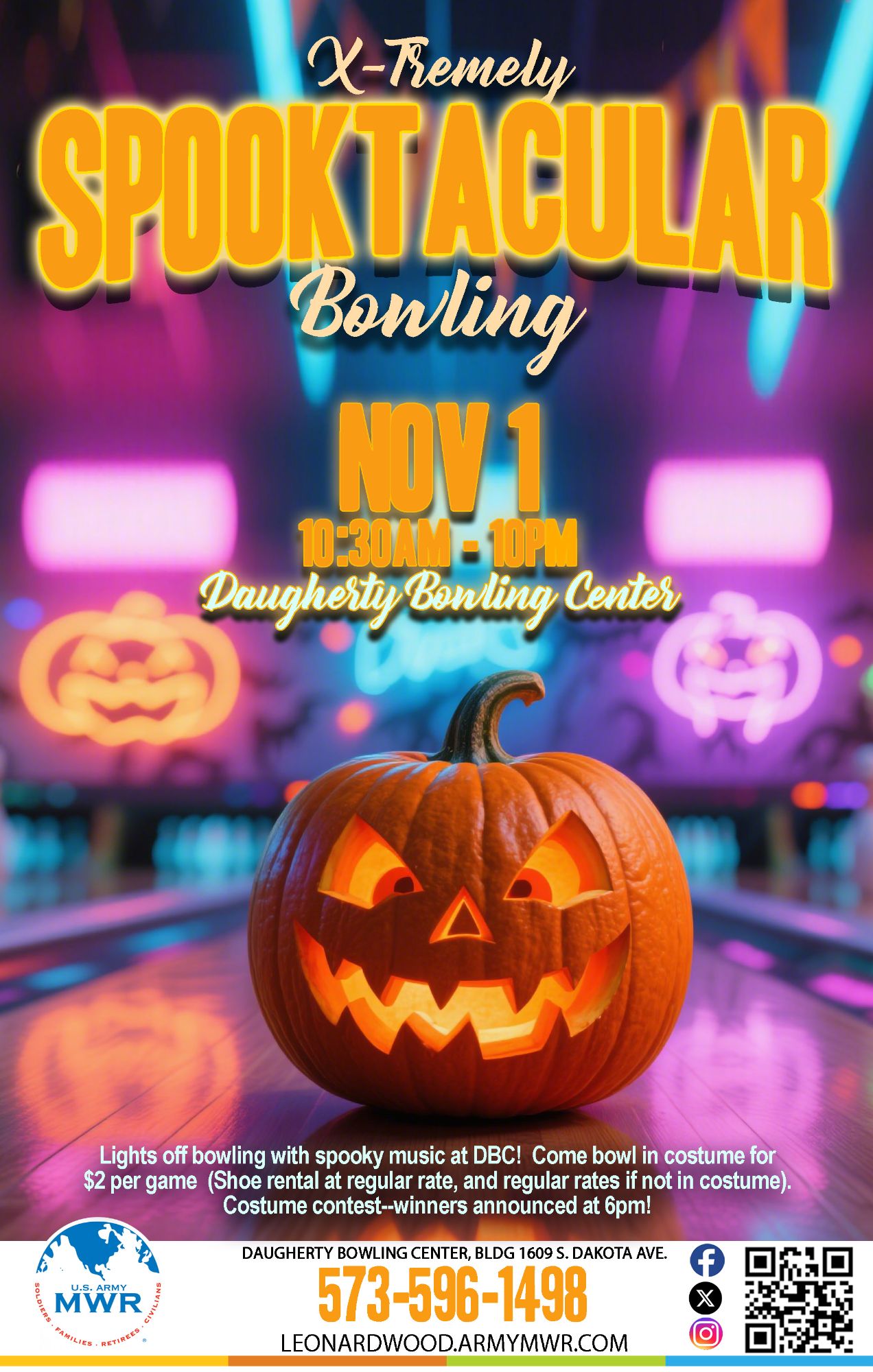 Enjoy lights off bowling with spooky music at Daugherty Bowling Center during X-tremely Spooktacular Bowling!