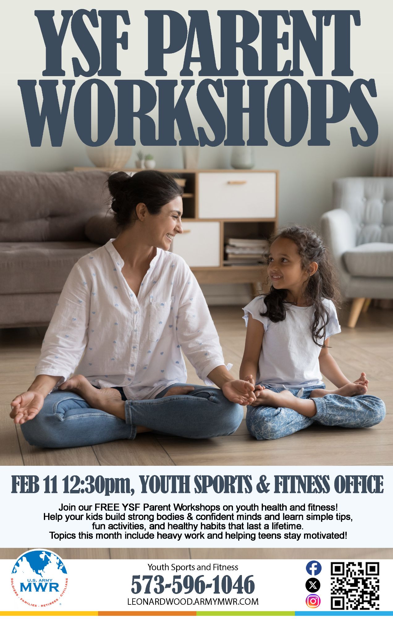Join our YSF Parent Workshops on youth health and fitness! Workshop will be held in the Youth Sports & Fitness Office (Bldg 470, Rm 1125).