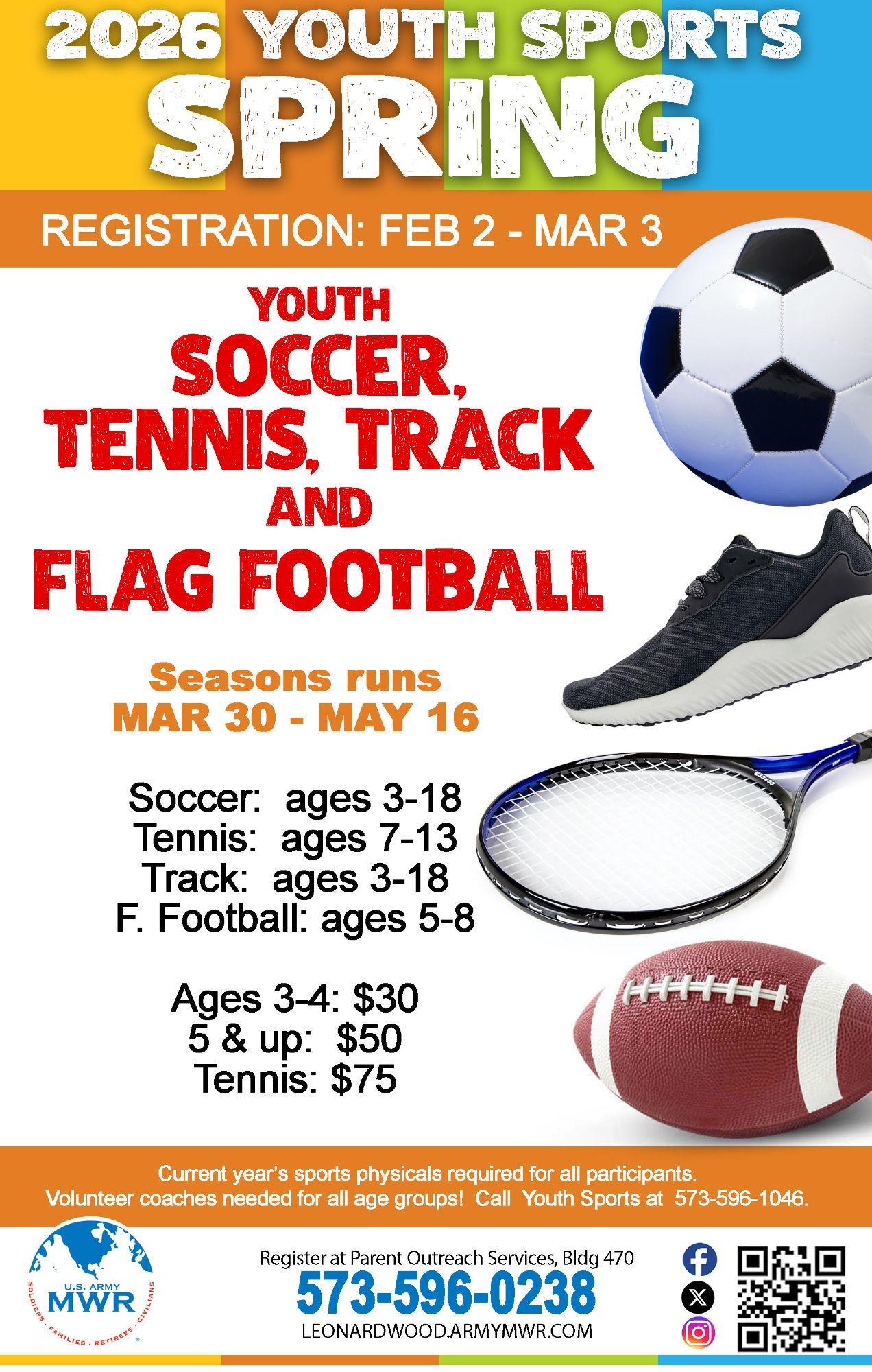 The 2026 Youth Sports & Fitness Spring Season will run from 30 March - 16 May. Season includes Soccer, Tennis, Track, and Flag Football.