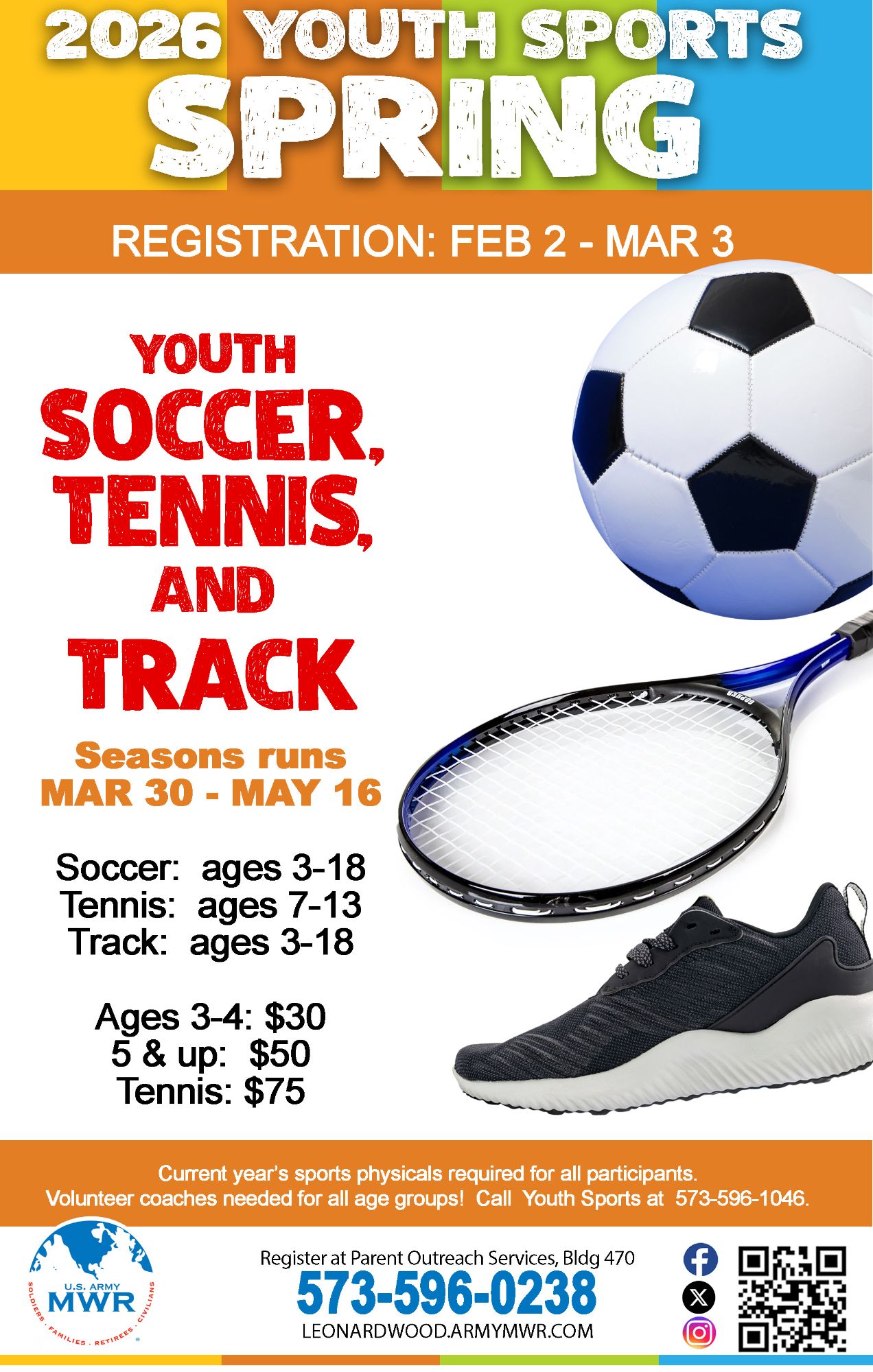 The 2026 Youth Sports & Fitness Spring Season will run from 30 March - 16 May. Season includes Soccer, Tennis, and Track.