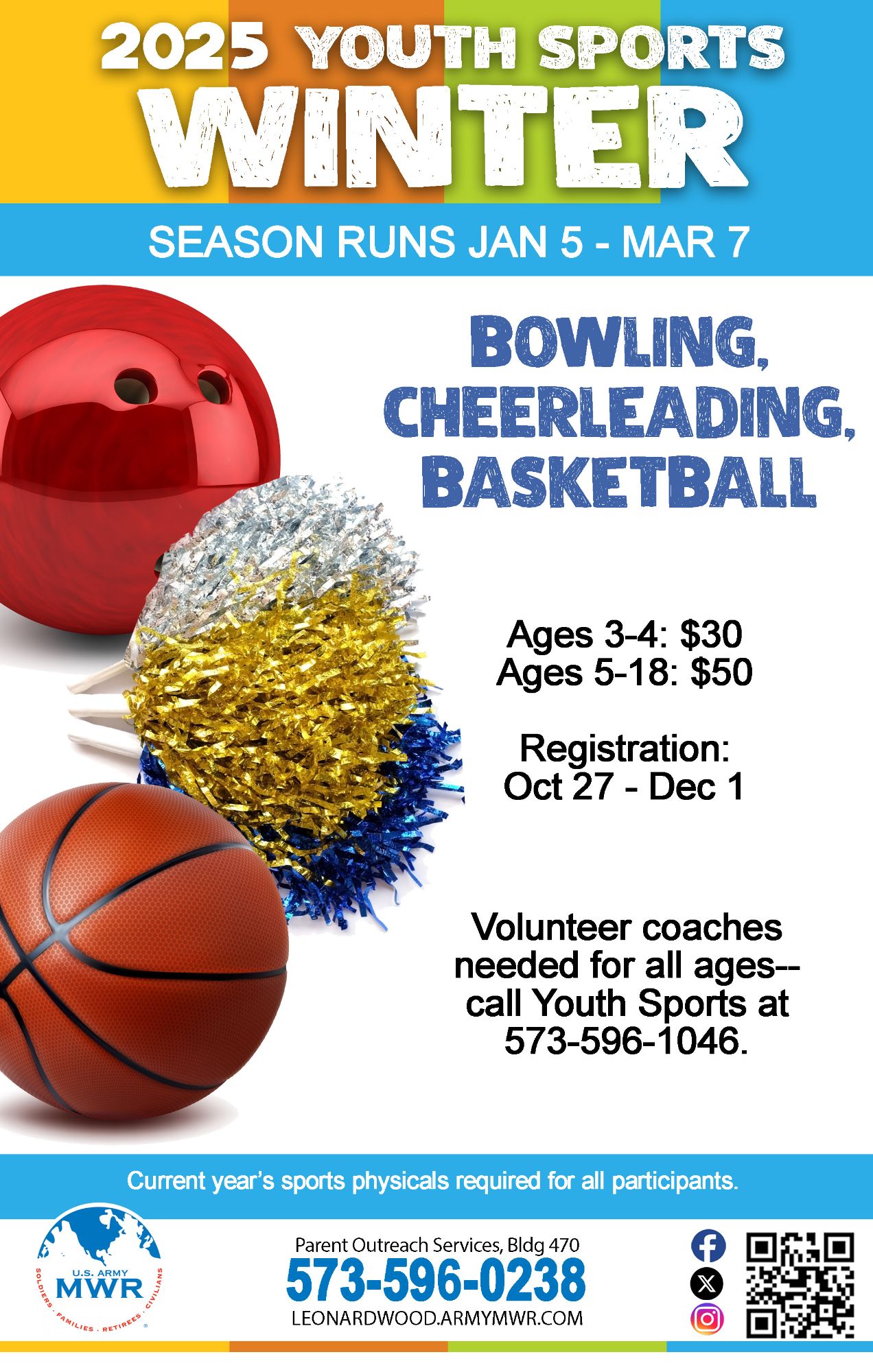 The Youth Sports & Fitness Winter Season will include Bowling, Cheerleading, and Basketball. The season will run from 5 January - 7 March.