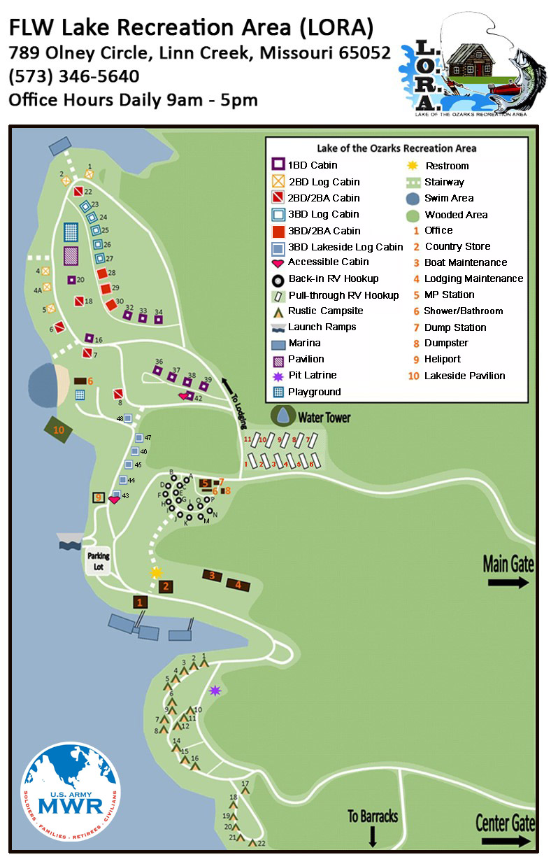 The Lake of the Ozarks Recreation Area (LORA) is a great destination for camping, boating, swimming, water skiing, fishing and other outdoor activities. The lake is one of the Nation's largest man-made lakes, providing you with over 1150 miles of shoreline to enjoy. LORA welcomes Active Duty Military, Retired Military, members of the National Guard and Reserves, DoD employees with ID cards, family members and Fort Leonard Wood contract employees.