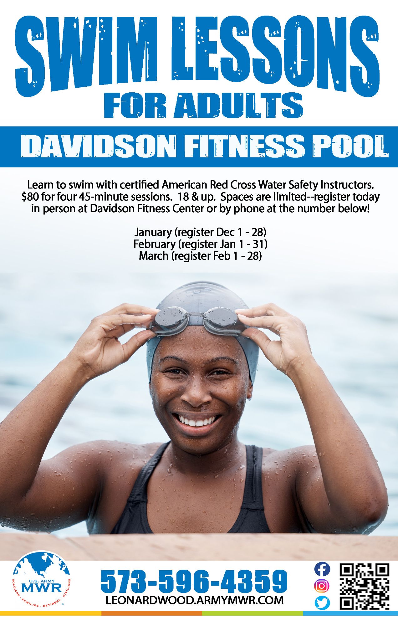 Learn to swim with certified American Red Cross Water Safety Instructors. Adult Swim Lessons will be held at Davidson Fitness Center Indoor Pool.