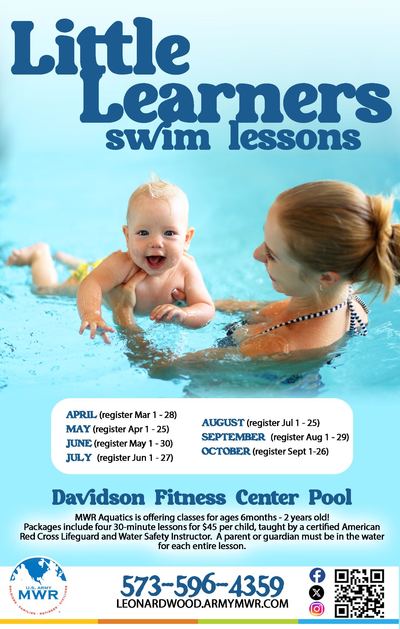 MWR Aquatics is excited to start Little Learners Swim Lessons open to ages 6 months - 2 years! Class is designed to get kiddos comfortable in the water while also helping parents/guardians learn to work with them in aquatic settings.