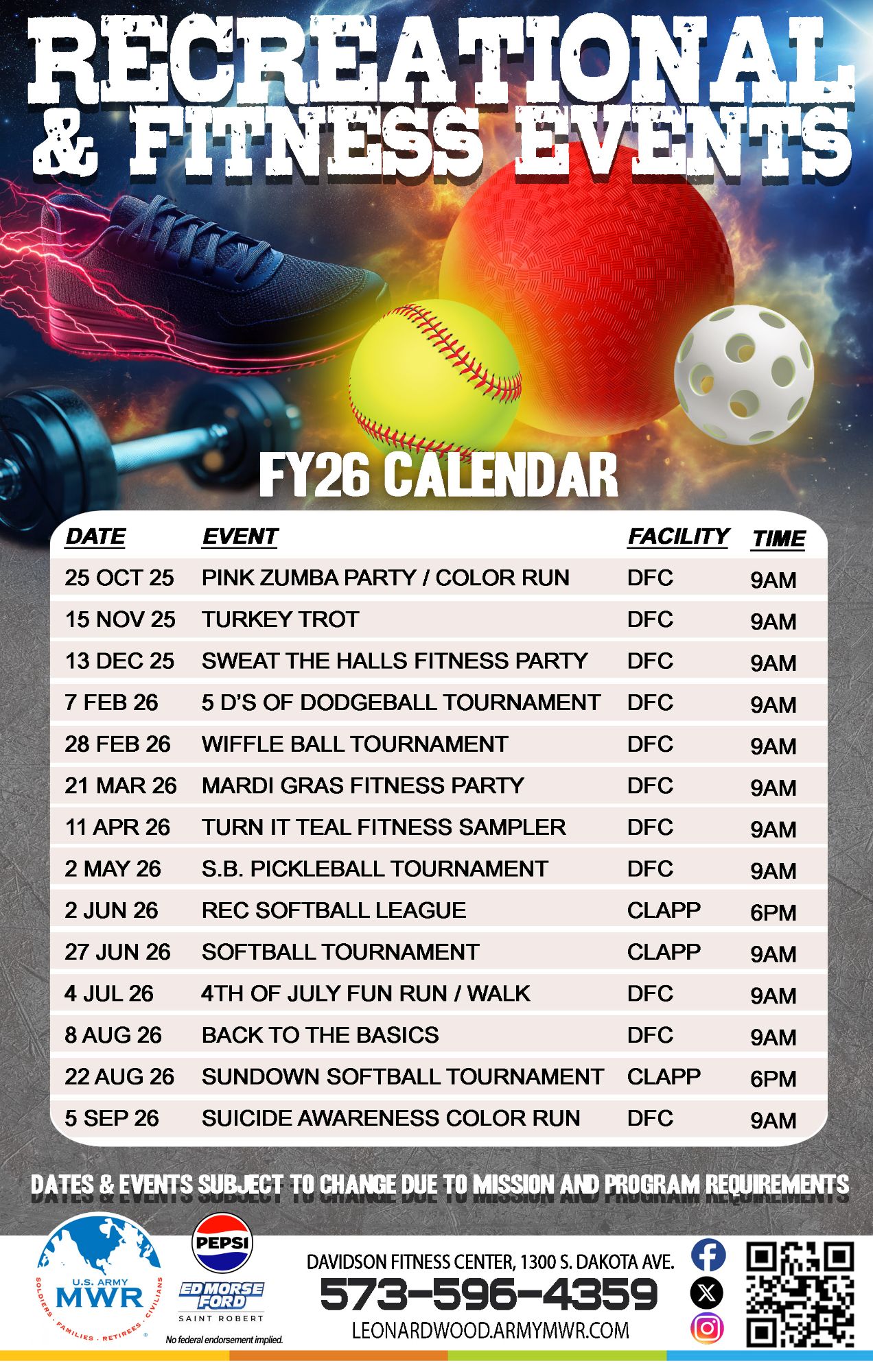 27 JUN 26 | Softball Tournament | Clapp Sports Complex | 9 am |