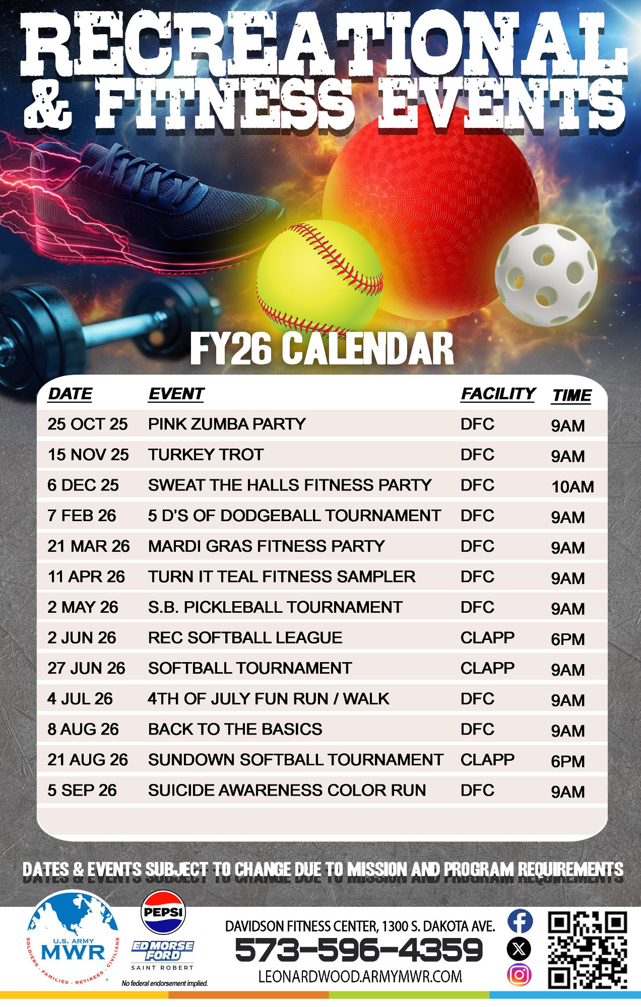 | 27 JUN 26 | Softball Tournament | Clapp Sports Complex | 9 am |